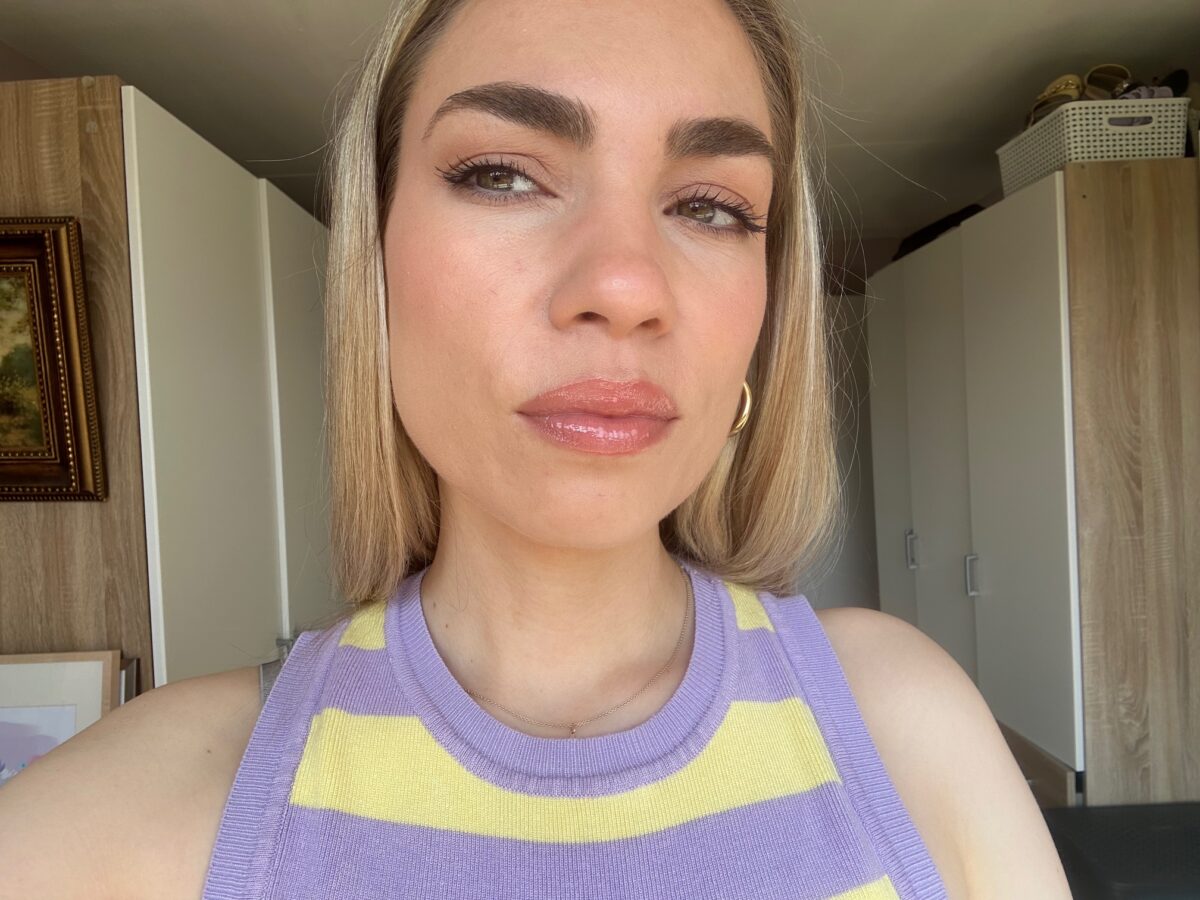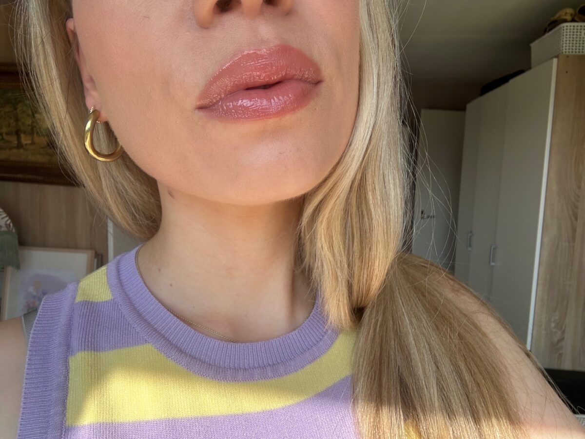 Ik heb eerst even de helft van mijn mond gedaan om het verschil te zien. Een gloss vangt het licht van alle kanten, dus daardoor krijg je ook snel een mooi vol uiterlijk. De applicator is heel fijn, heel zacht. De gloss zelf is ook fijn, hij plakt niet maar voelt zacht. De kleur is iets lichter dan ik had verwacht.
