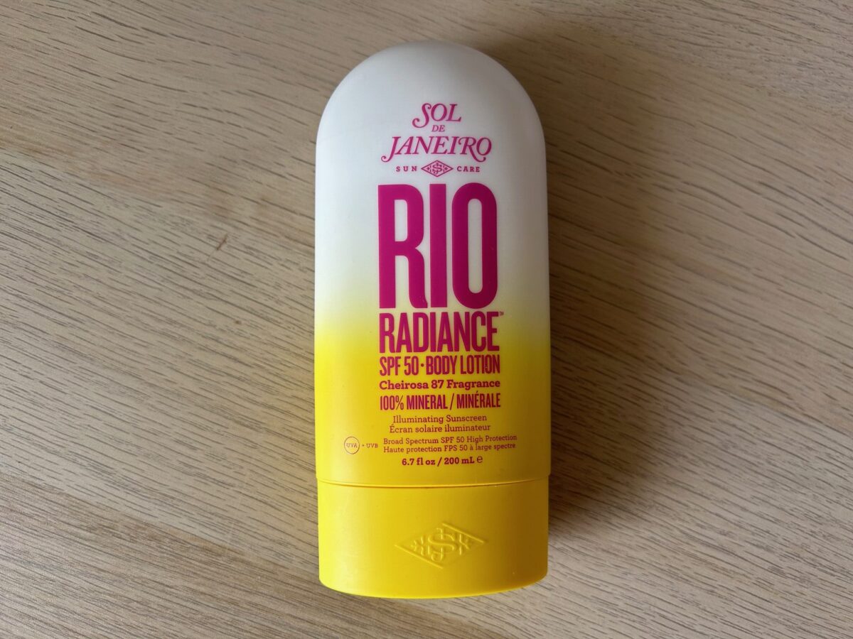 Een heerlijke SPF 50 lotion met een glansje waardoor ik straks helemaal lig te shinen aan het zwembad.