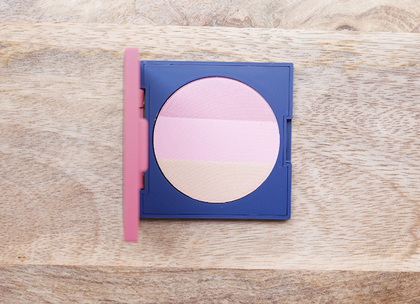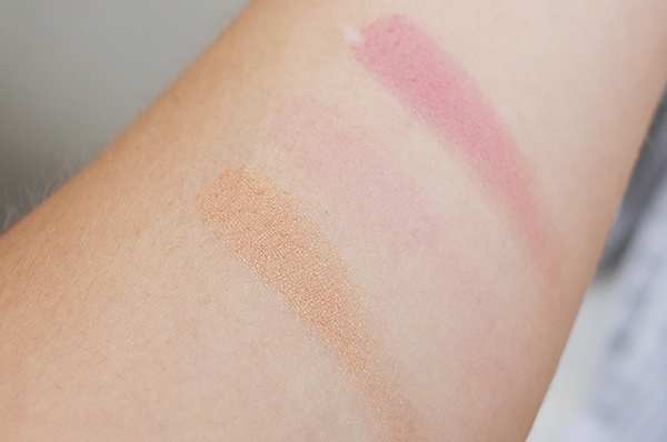 De kleuren los. De highlighter is wat donker van kleur en subtiel van glans. De twee rozetinten zijn erg mooi en goed met elkaar te combineren. De lichte tint is wel erg licht en zal alleen zichtbaar zijn op de echt lichte huid.