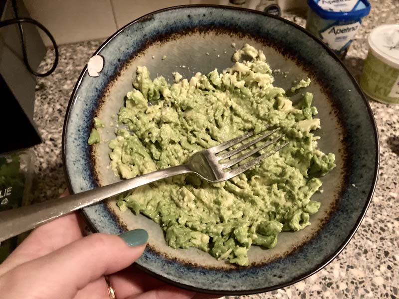 Het bakken van de kikkerwten neemt wel even in beslag, dus ondertussen prak ik de avocado in een schaaltje om de saus te maken.