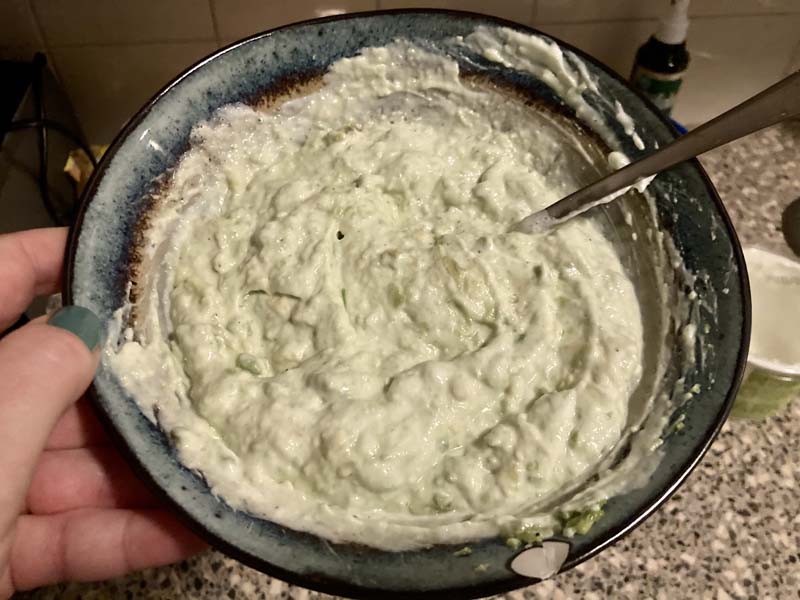 Daar roer ik de kwark door, en breng het op smaak met een heel klein beetje zout, peper en een drupje limoensap. Niet teveel, het gerecht is al vrij zout dus dit moet echt een frisse saus worden.