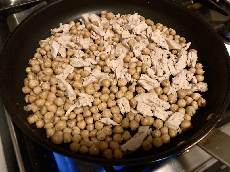 Ik begin met het afspoelen van de kikkererwten onder de kraan in een vergiet. In een hete pan met wat olijfolie bak ik deze vervolgens droog en goudbruin.