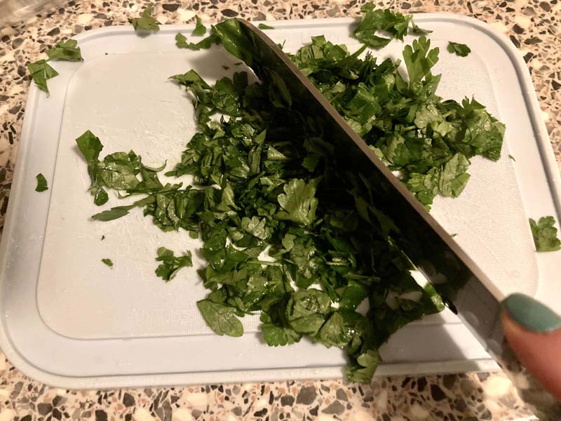 Ook was en hak ik de peterselie vast. Als de kikkererwten en de kip ondertussen klaar zijn, haast je dan niet maar gooi het gewoon vast in een schaal. Het is niet erg als het iets afkoelt, het gaat straks allemaal weer in de pan.