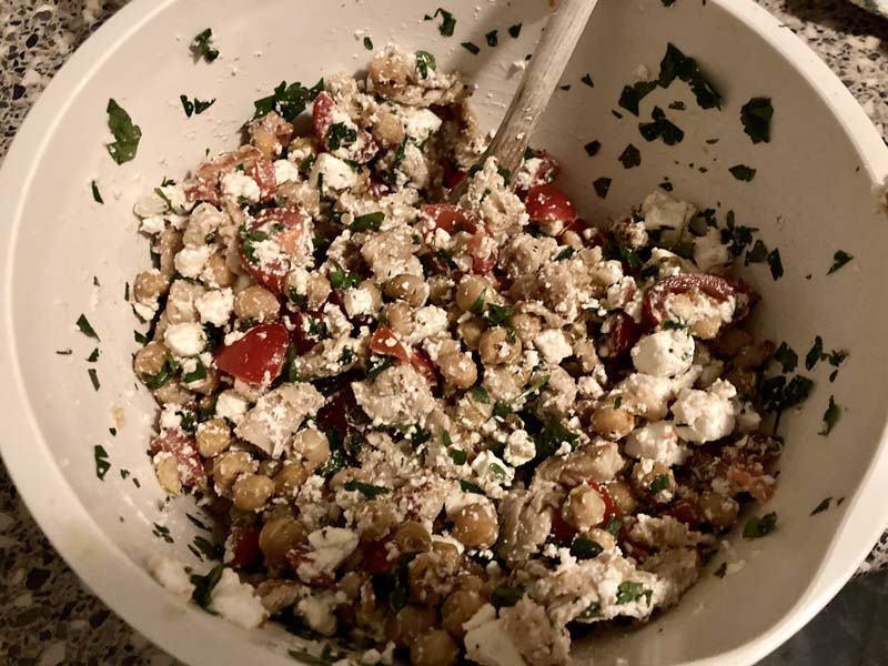 Door de kip en kikkerwten gaat de peterselie, de tomaten die ik in hele kleine stukjes snijd en de ‘feta’ die ik verkruimel. Ik heb nu cherrytomaten gebruikt omdat ik deze toevallig nog had, maar gewone tomaten kunnen ook.