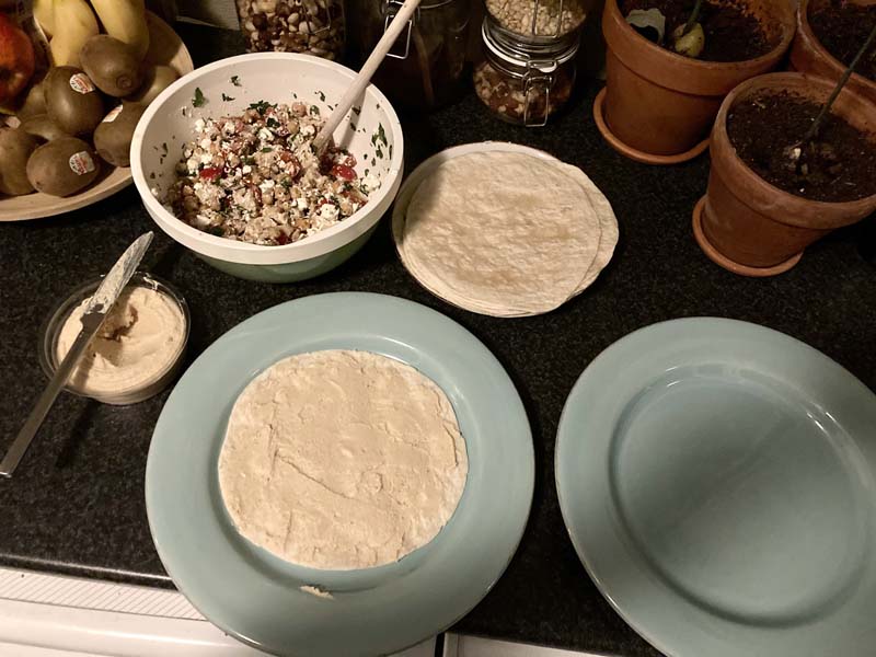 Dan maak ik een wrap-smeer-stationnetje. Je hebt zeker wel twee grote borden nodig en een klein bordje. Ik smeer hummus op twee wraps, deze komen zo op elkaar als een boterham met boter en beleg.