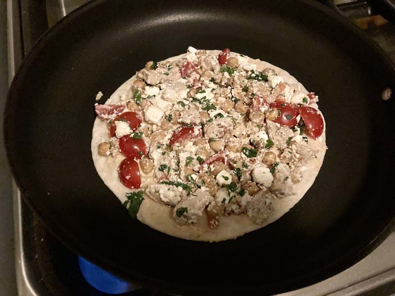 De eerste wrap gaat met een beetje olie in de pan, en hier schep ik het mengsel erop. Niet een te dikke laag, gewoon de bodem bedekken. Uiteraard leg je dit op de met hummus besmeerde kant, dan plakt het lekker. Zet het vuur laag, want als de pan straks heter wordt gaat het soms sneller dan je kan smeren en scheppen.