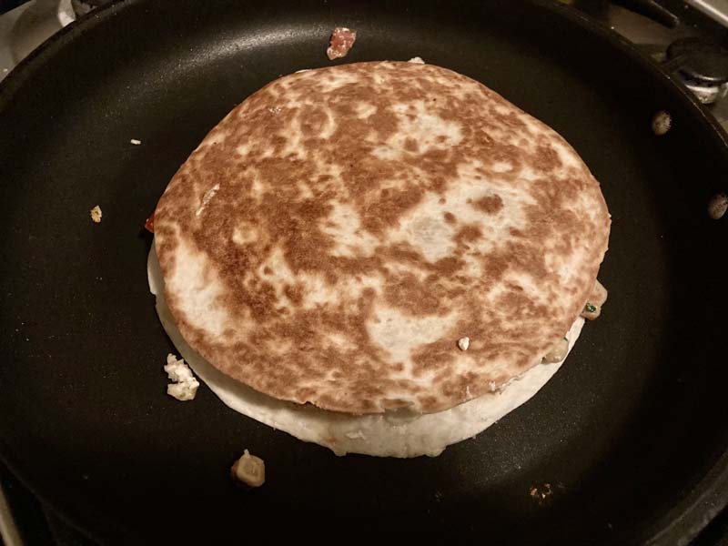 Dan spiek je even met een spatel of de wrap al bruin is. Dit gaat best snel dus blijf er echt bij. Als hij mooi goudbruin is draai je hem om. Dat is een tricky klusje, dus doe het zelfverzekerd en snel. Je kan ook een bordje op de wrap leggen om je zo te helpen. Als er wat uitvalt, who cares, dat stop je er zo weer tussen. Ik pak hierom wel de wraps in medium formaat, want de grote zijn natuurlijk nog lastiger te draaien.