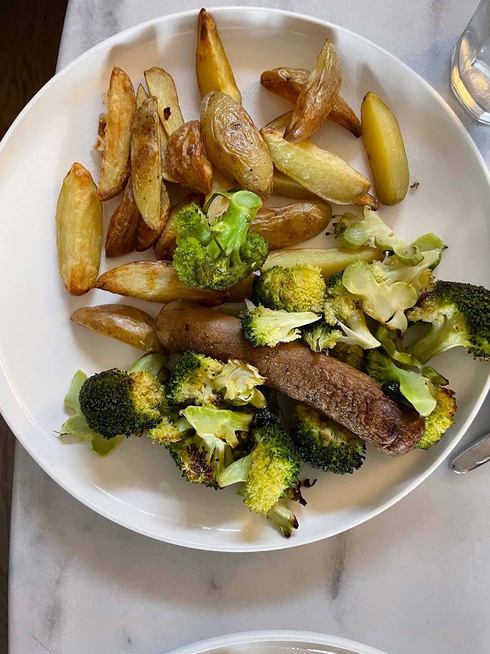 Dit blijft bij ons toch echt een standaard favoriet: een AVG’tje, oftewel aardappels-groente-vlees. Je kan er lekker mee variëren en ik doe vaak de aardappels in de oven zodat ze lekker krokant worden. Qua groente is het maar net wat er in het seizoen is en waar we zin in hebben, en ook de manier van bereiden is elke keer anders. Soms kook ik het gewoon, soms maak ik er een traybake van en bak ik de groente ook in de oven. Vooral met spruitjes en broccoli vind ik dat erg lekker. Fijn aan een traybake is dat het heel weinig werk is en de oven alles doet (behalve het snijden, hehe).