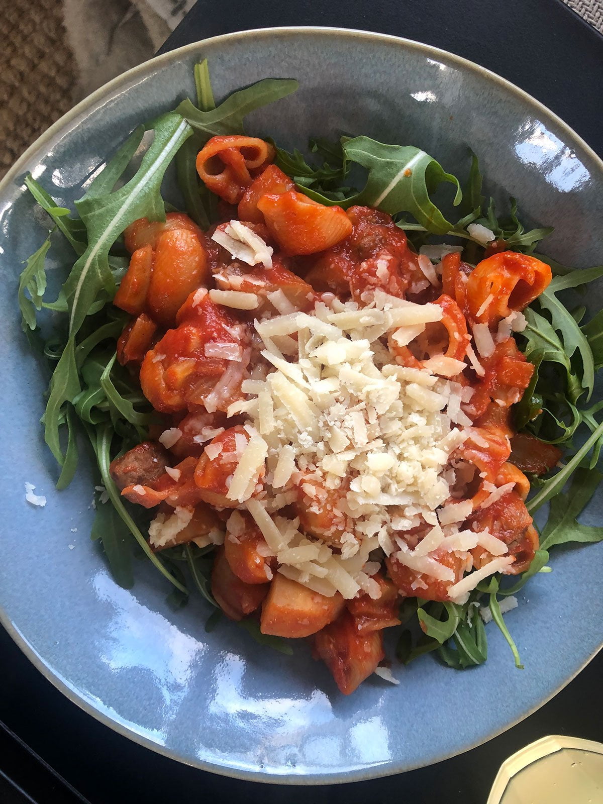 Dit maakt Willem regelmatig: ‘zijn’ venkelpasta. Hij bakt een ui en twee venkels (gesnipperd). Runderchipolataworstjes in stukjes bakken. Tomatenpassata erbij, peper en zout. Lekker laten pruttelen. En dan serveren met volkoren pasta, parmezaanse kaas en Rucola.