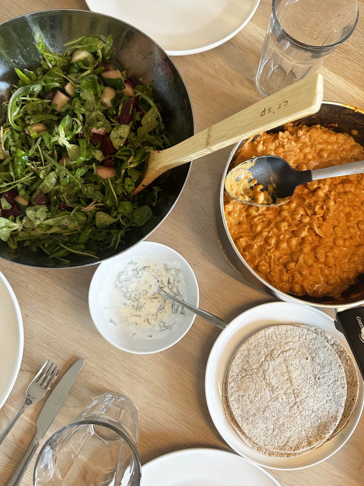 We aten met meerdere mensen, dus hop de pan op tafel en zelf de tortilla’s vullen.