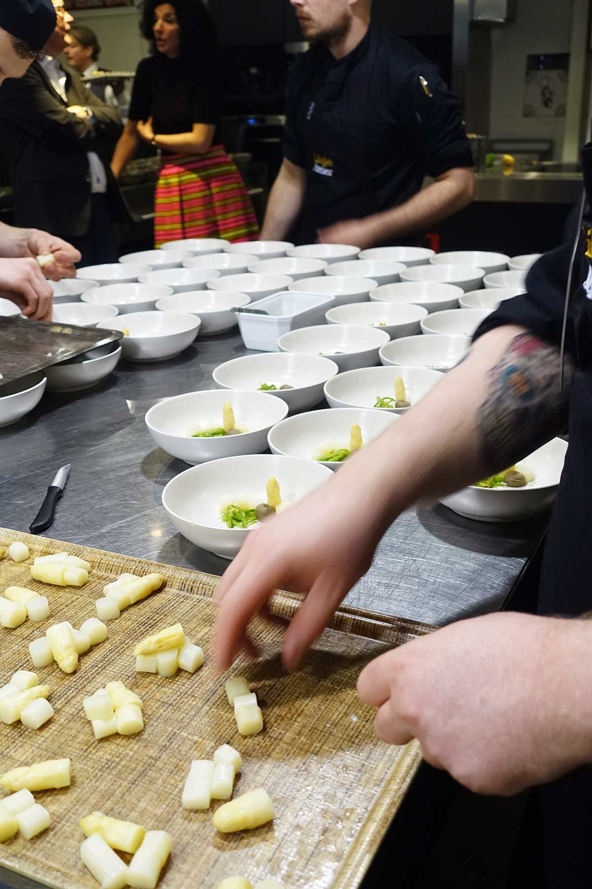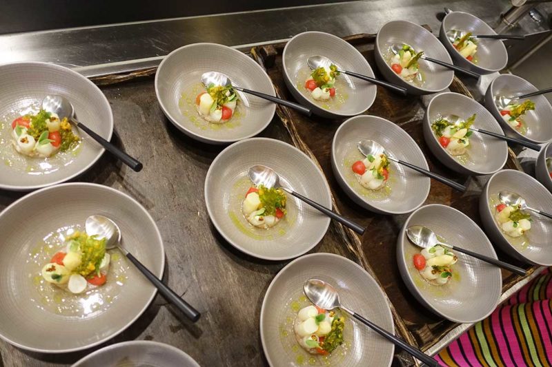 We staan in Librije’s Atelier, dus we zien hoe de gerechtjes voor onze neus (af)gemaakt worden.