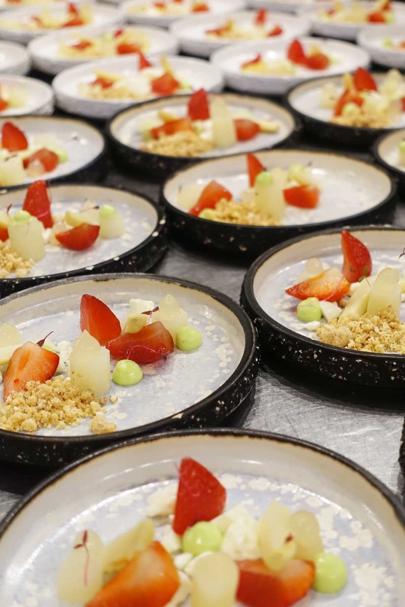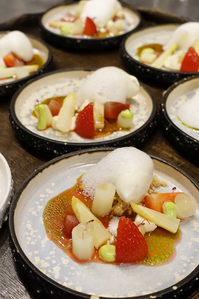Het laatste gerechtje: het dessert, ook met asperges! Ik proefde asperges, aardbeien van Kalter uit IJsselmuiden met sorbet van asperge en dragonolie. Nooit gedacht dat asperges en aardbeien zo’n goede combinatie zouden zijn!