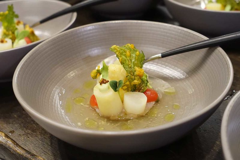 We gaan verder met forel uit Hattem! De Librije koopt deze forel van een particulier die ze graag vangt. Het is een koude tartaar met asperge, tomaat en limoenblad. Ook dit is weer een heel fris gerechtje, iets zout door de forel, maar vooral zoet, wat kruidig en krokant. De asperge is deels rauw en er zit een tempura-achtig krokantje bovenop.