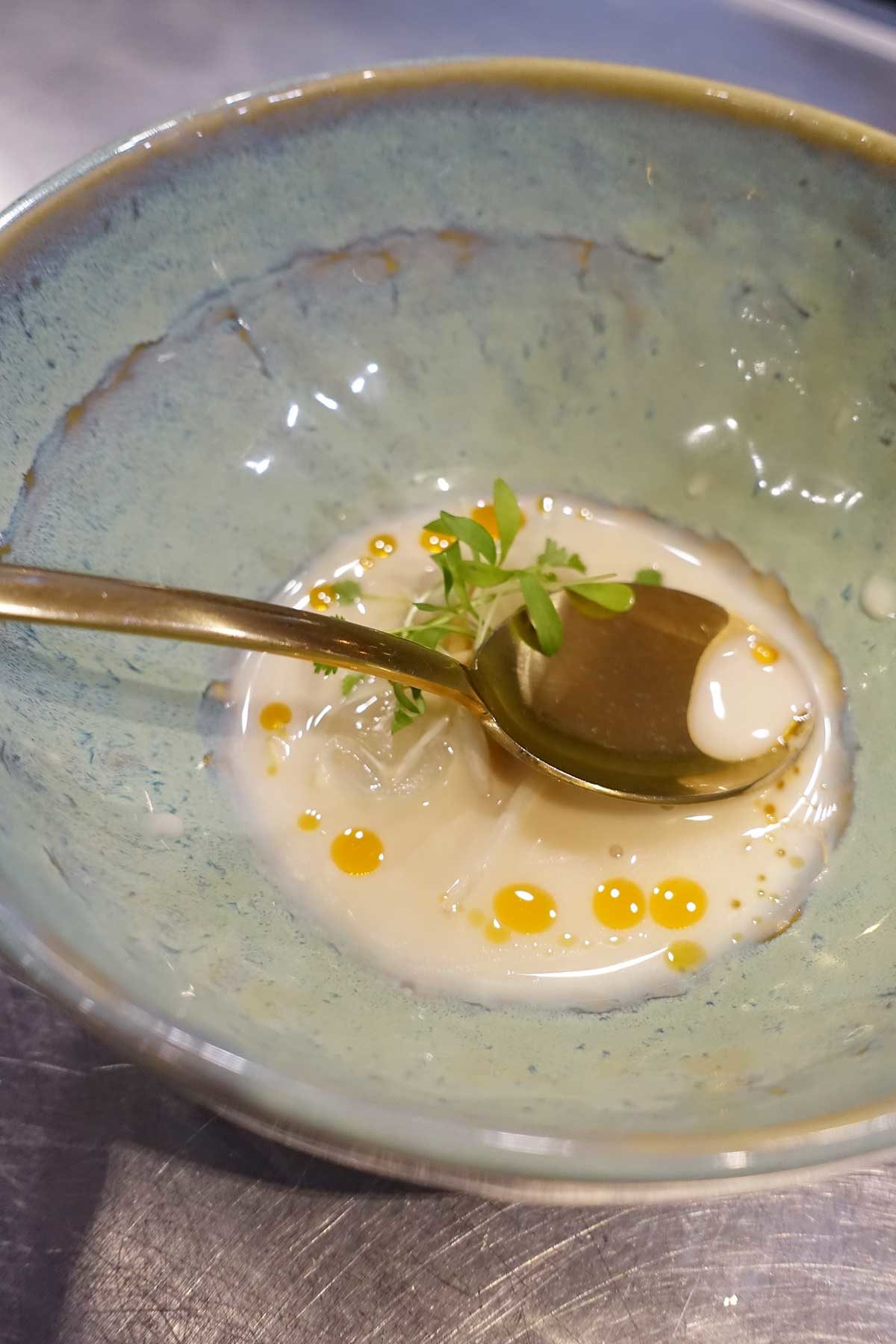 Tijd voor soep. Het is een Tom Ka Kai met klassieke smaken van kokos, citroengras en taugé, maar dan – je raadt het al – met asperges uit Raalte. Een beetje Thailand gemengd met een beetje Salland.