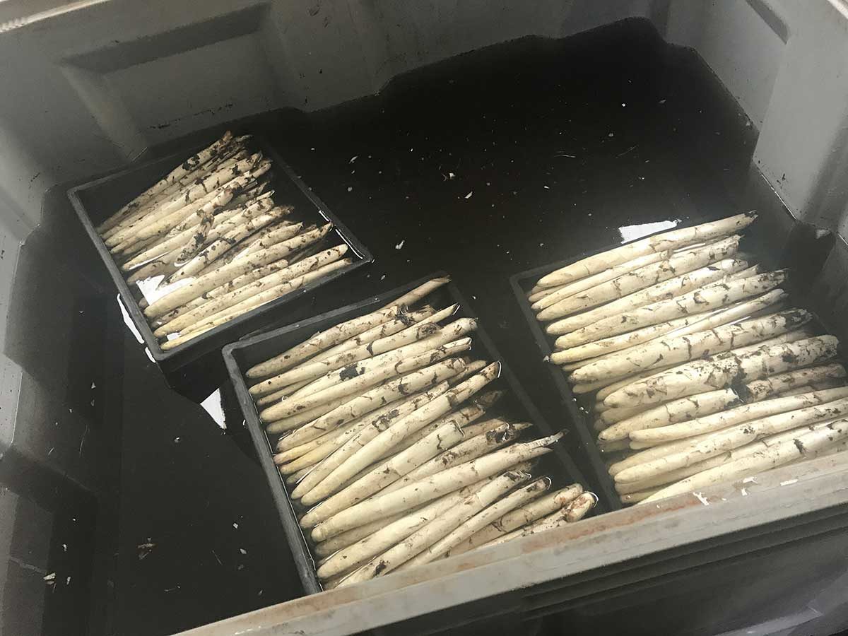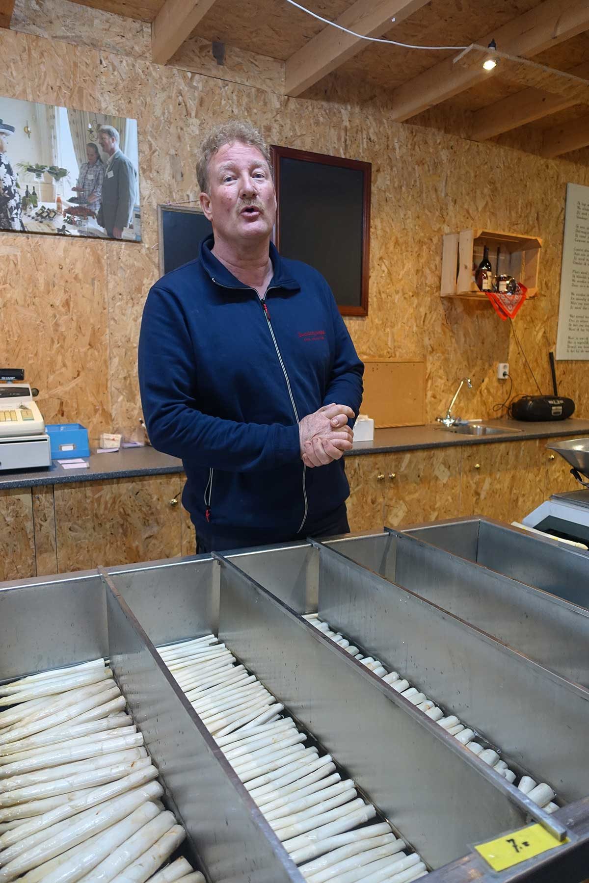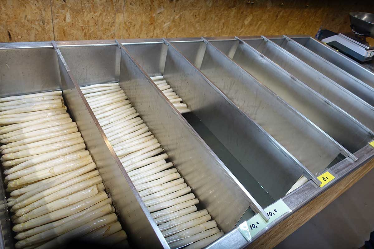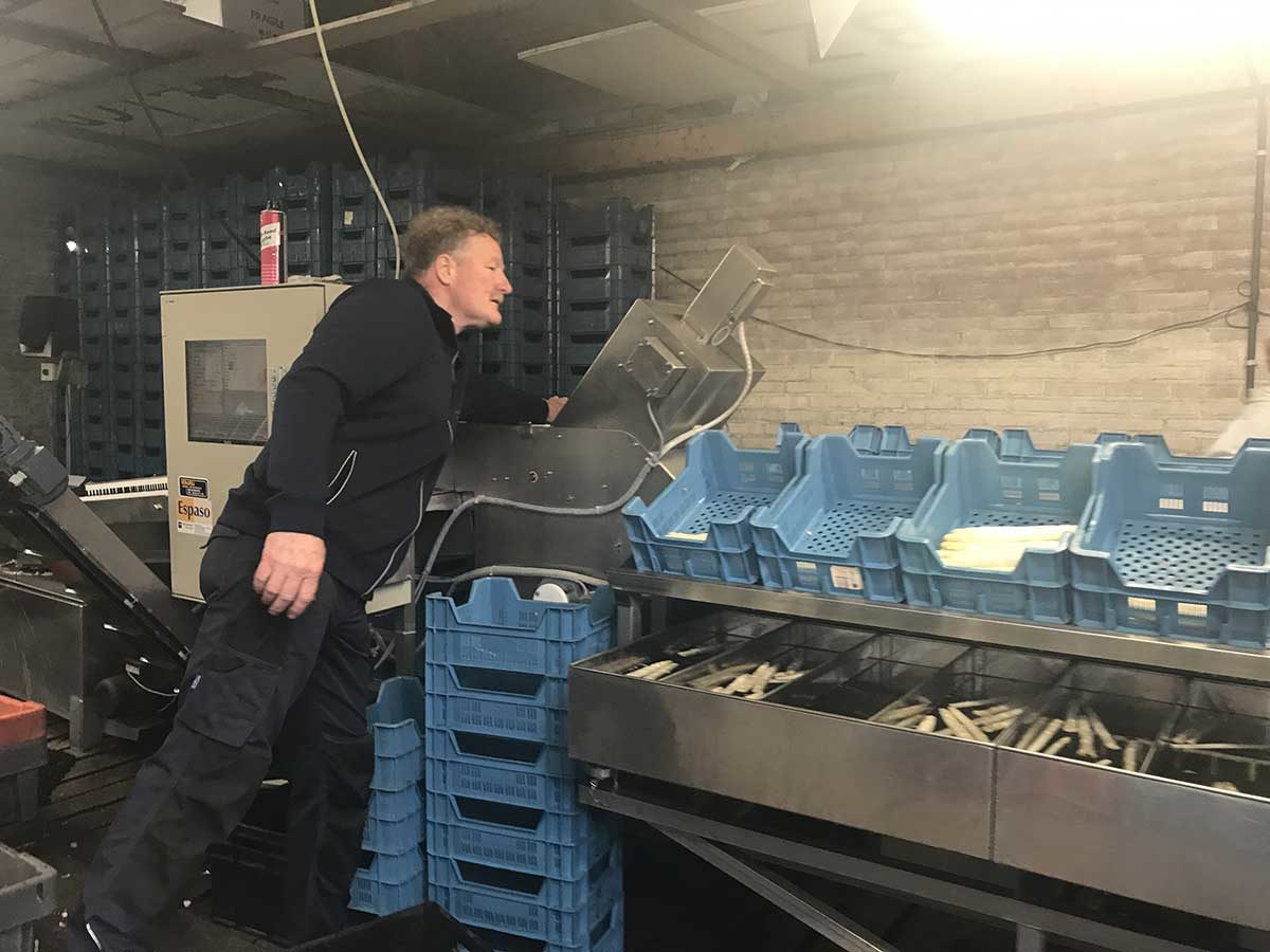 De asperges, gewassen en gesorteerd in de boerderijwinkel. Ernie verkoopt met zijn team hier de asperges, ze zijn niet te koop in andere winkels. En natuurlijk levert hij aan restaurants.