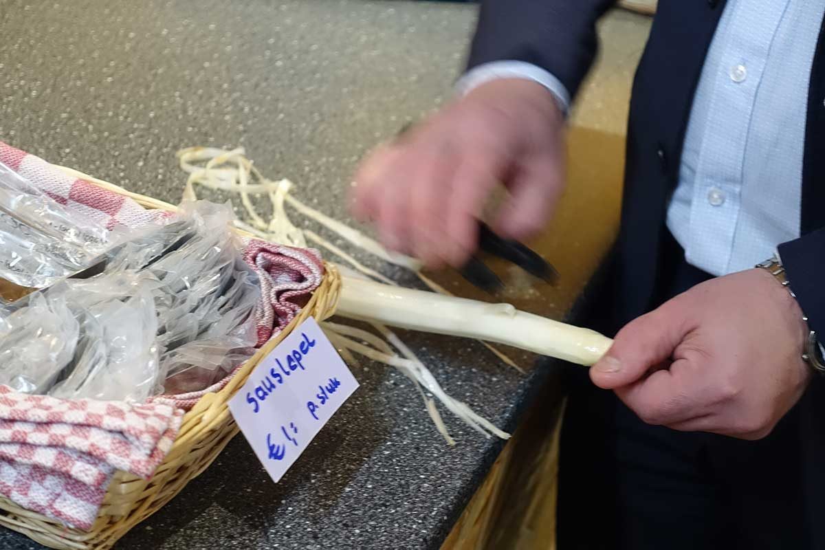 Tipje voor het schillen: houd de asperge bij de kop vast en schil van boven naar beneden met de dunschiller, twee keer rond. Ernie heeft in de winkel ook een schiller staan die het automatisch voor je doet, daar ga ik voor…