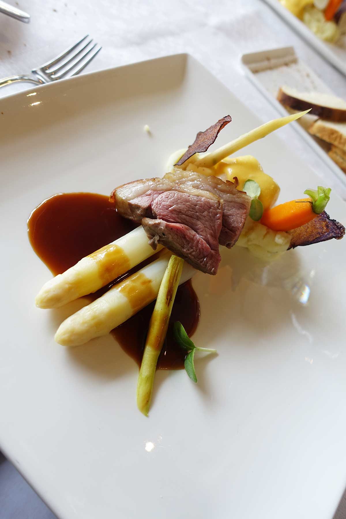Het hoofdgerecht bestaat uit Sallandse hele asperges met mousseline, Hollandaise, truffelaardappel, lamsrump en saus met foelie. De lamsrump is boterzacht en heeft een lekkere barbecuesmaak.