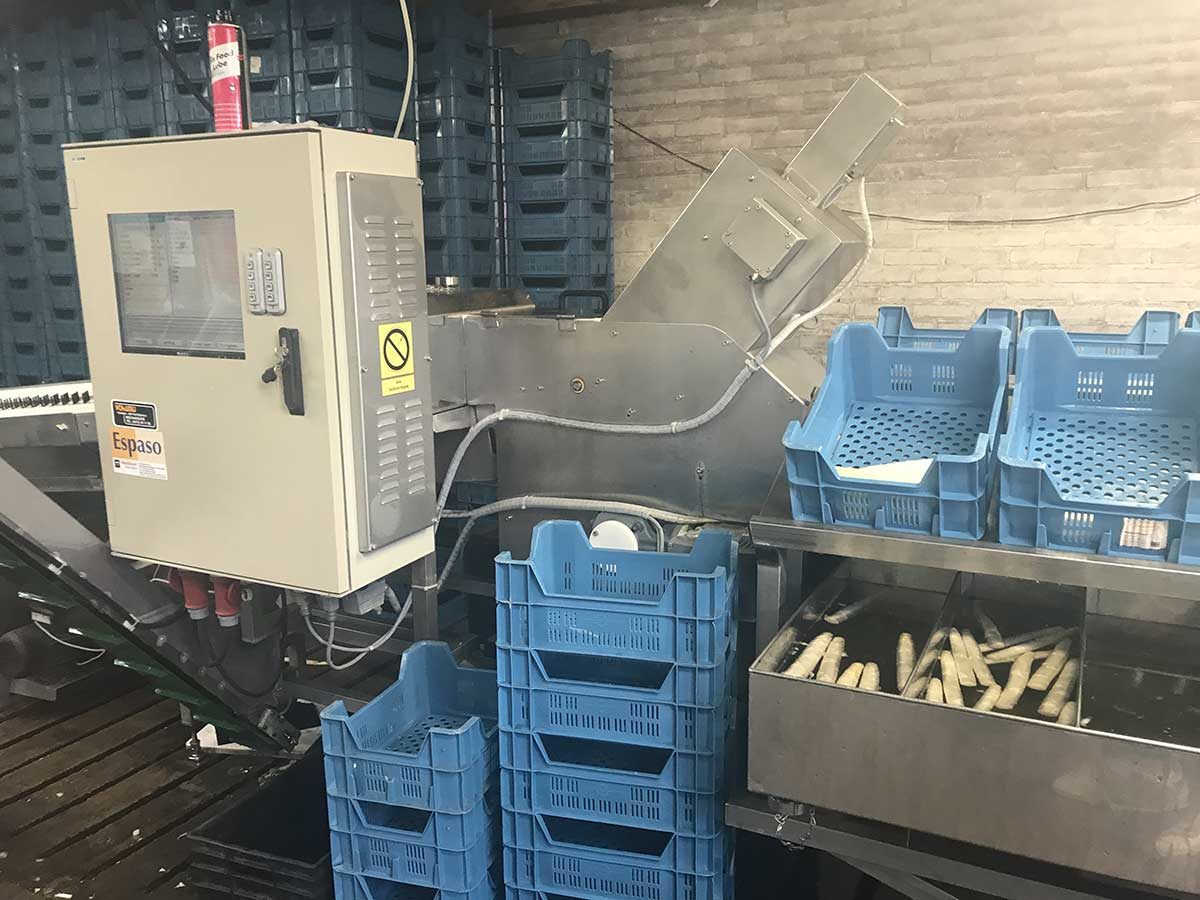 De sorteermachine: er zijn verschillende diktes asperges en die worden allemaal voor een andere prijs verkocht. Sommige mensen willen per se triple A, anderen vinden dikkere asperges prima. De smaak? Geen verschil.