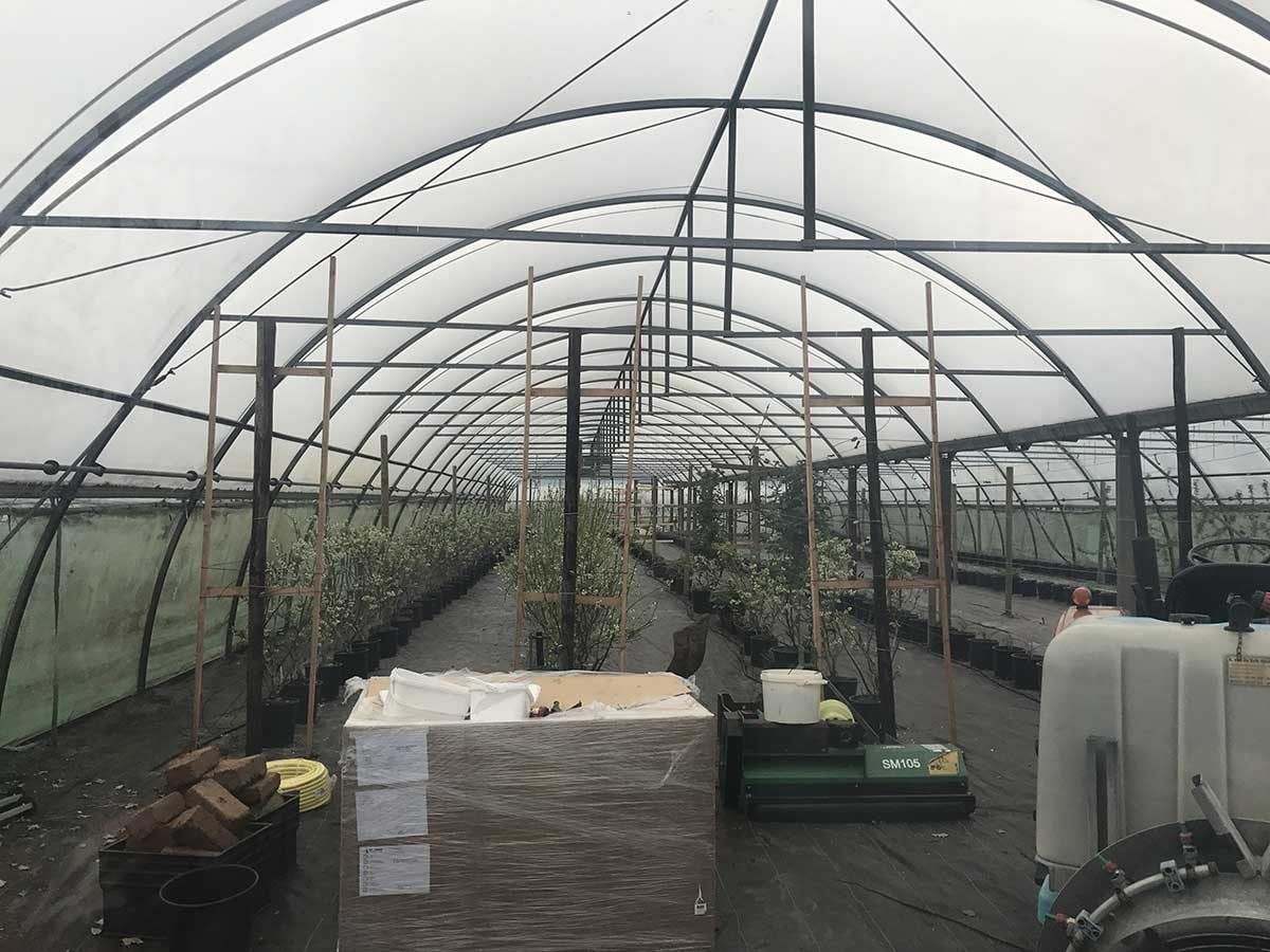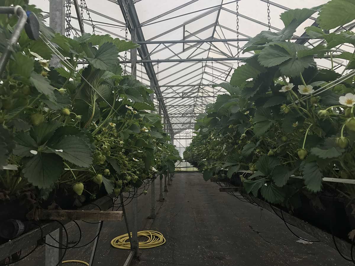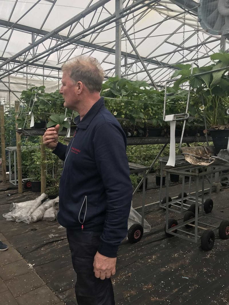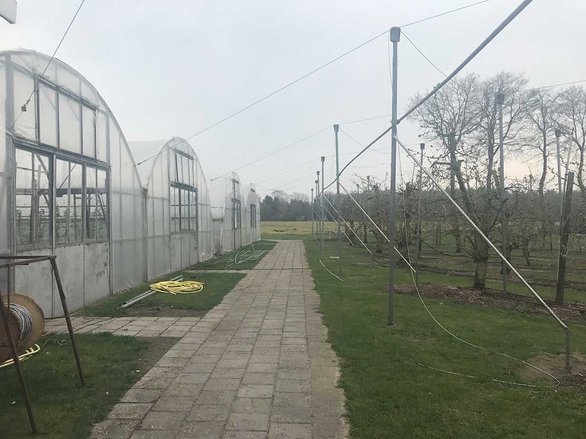 Kersenbomen rechts en links de kassen waar hij onder andere aardbeien en frambozen verbouwt.