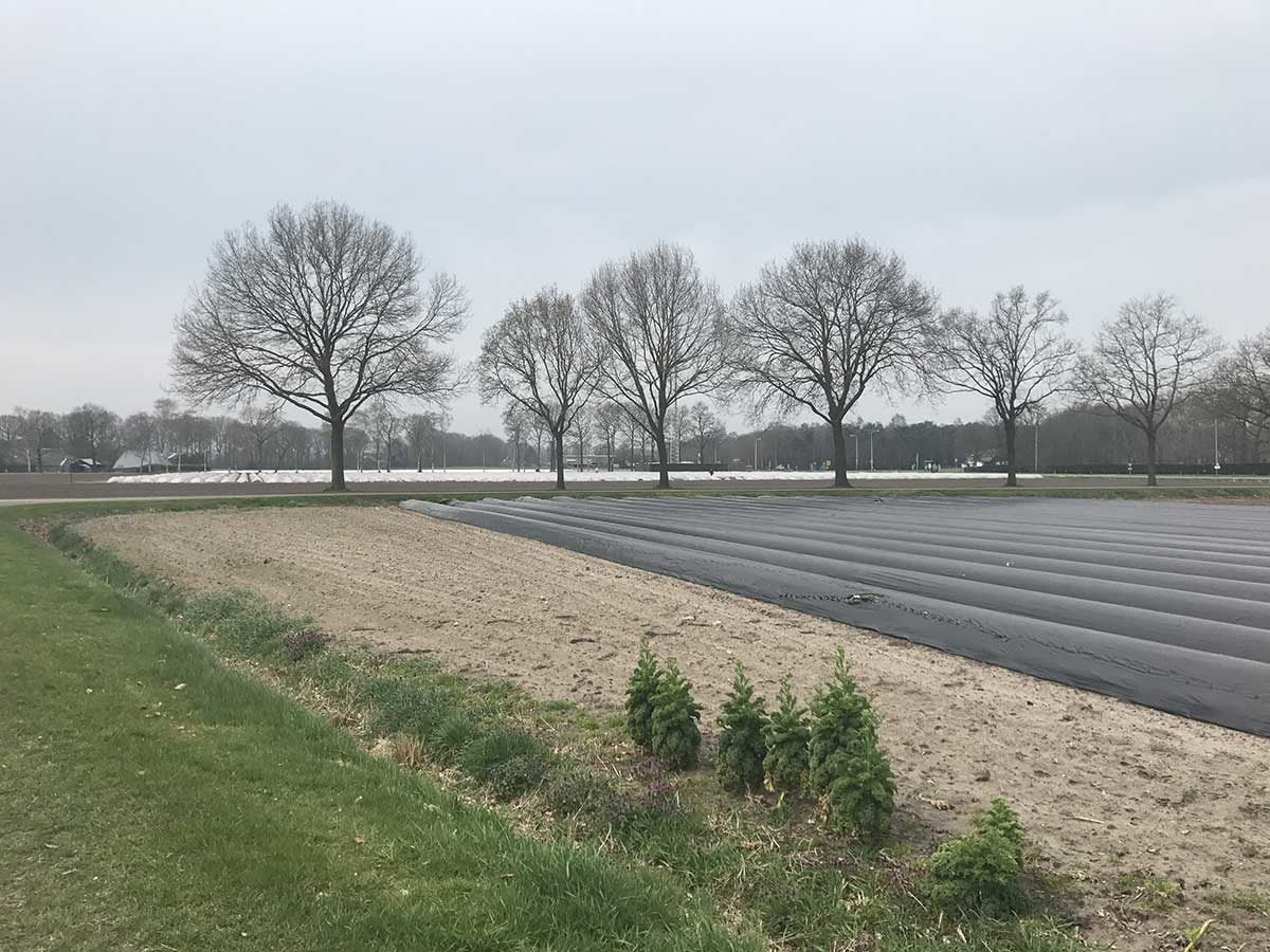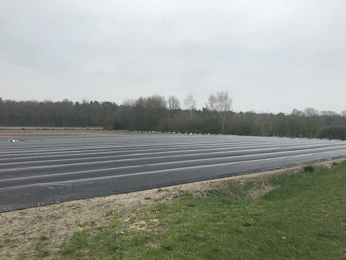Onder het zwarte plastic groeien de asperges. Door het plastic blijft de grond lekker warm waardoor de asperges beter groeien.