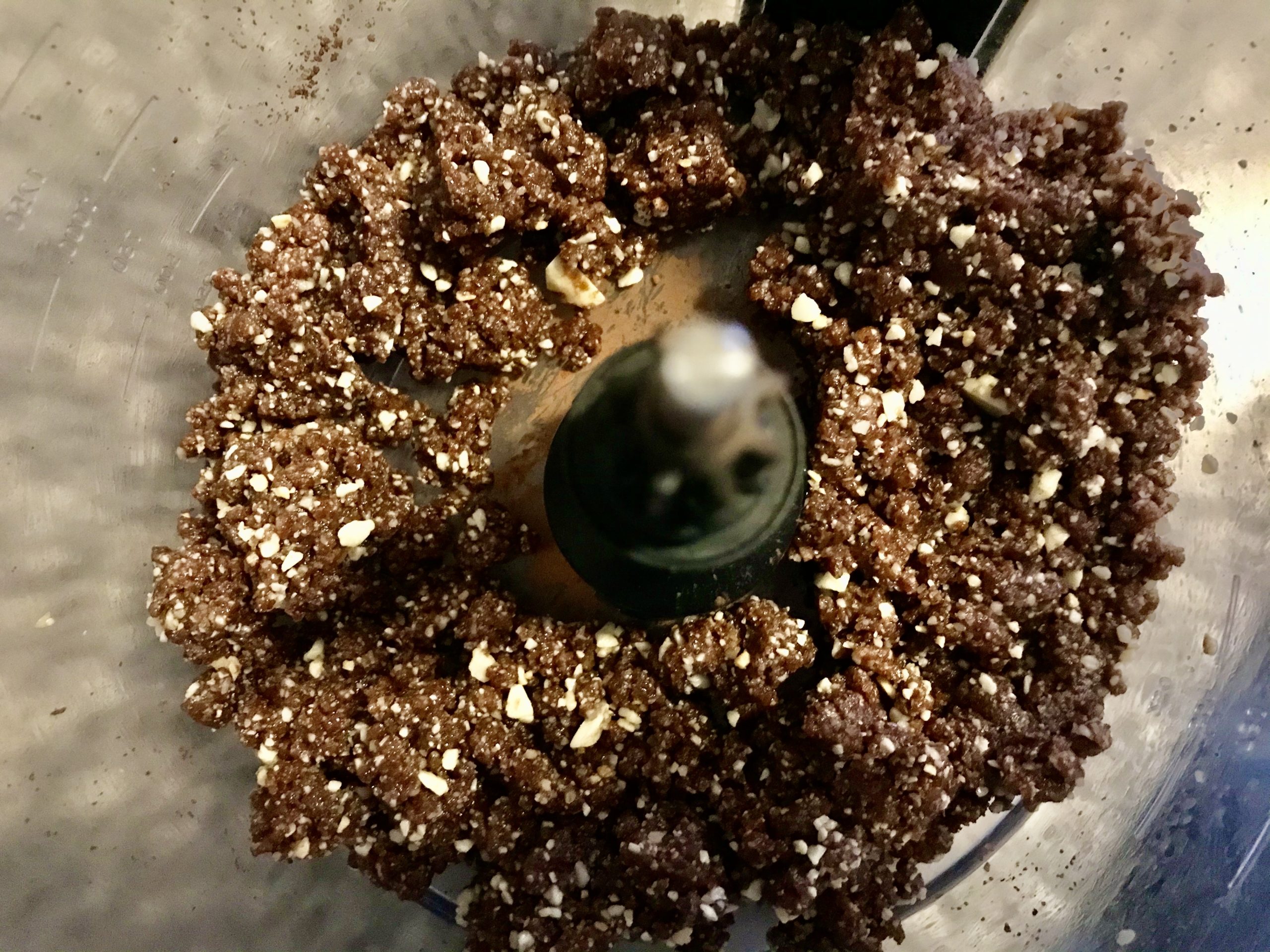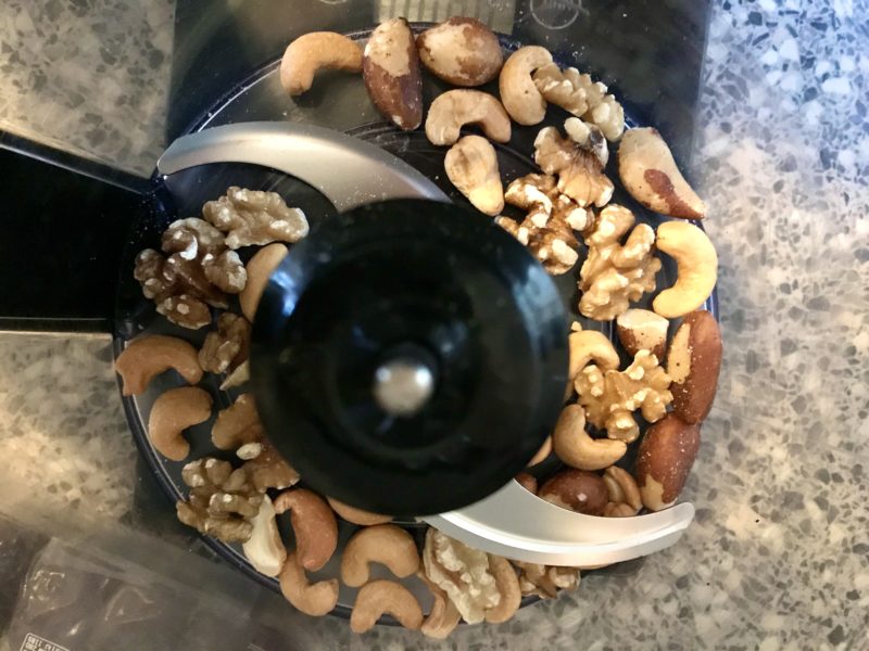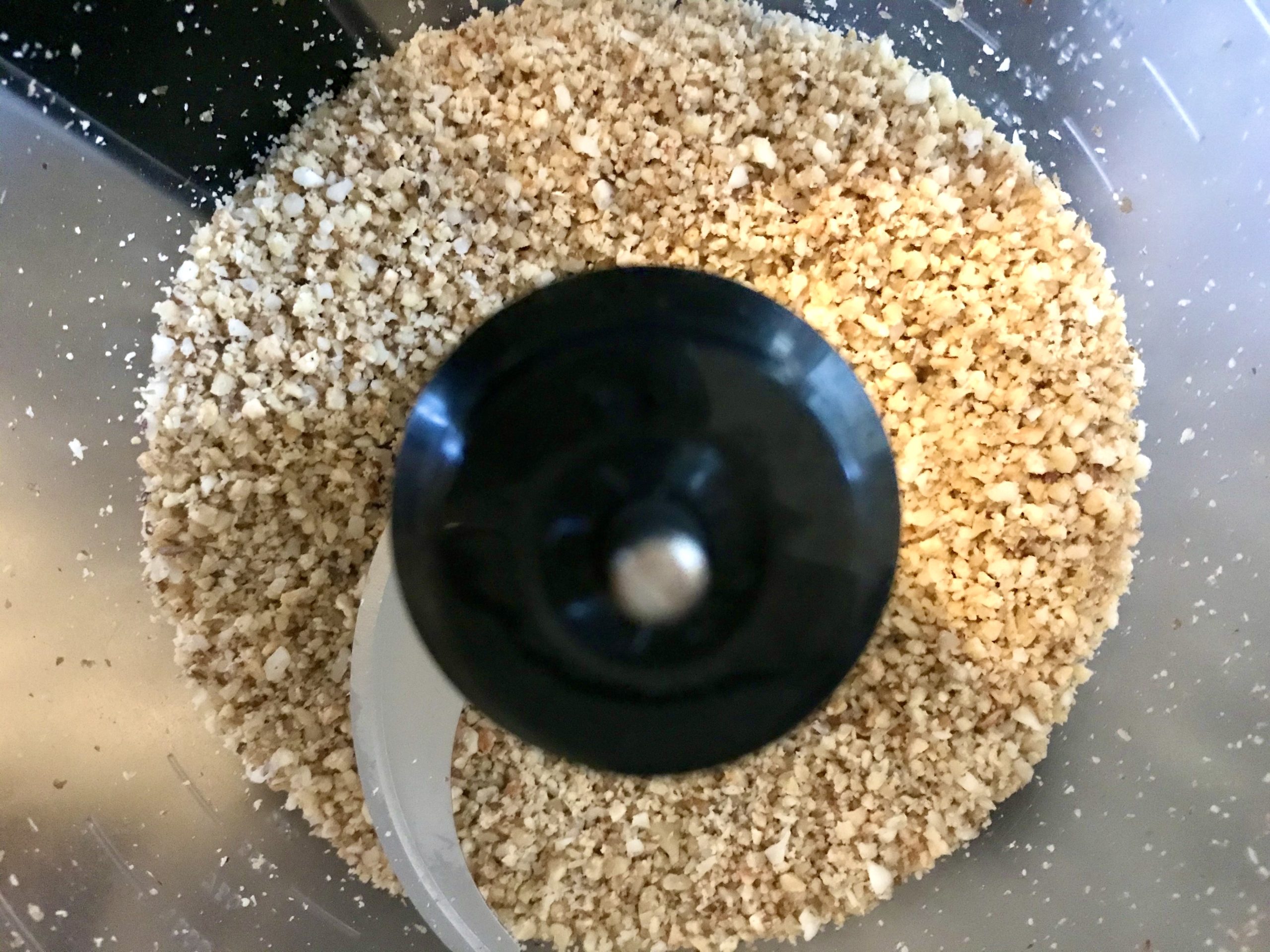 Het fijnste is als je een keukenmachine, blender, staafmixer of nutri-bullet tot je beschikking hebt want dan hoef je zelf niet te hakken. Ik heb zelf een keukenmachine en ik begin met het hakken van de nootjes.