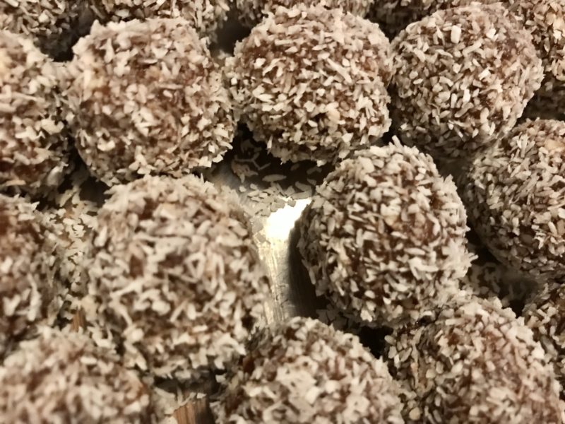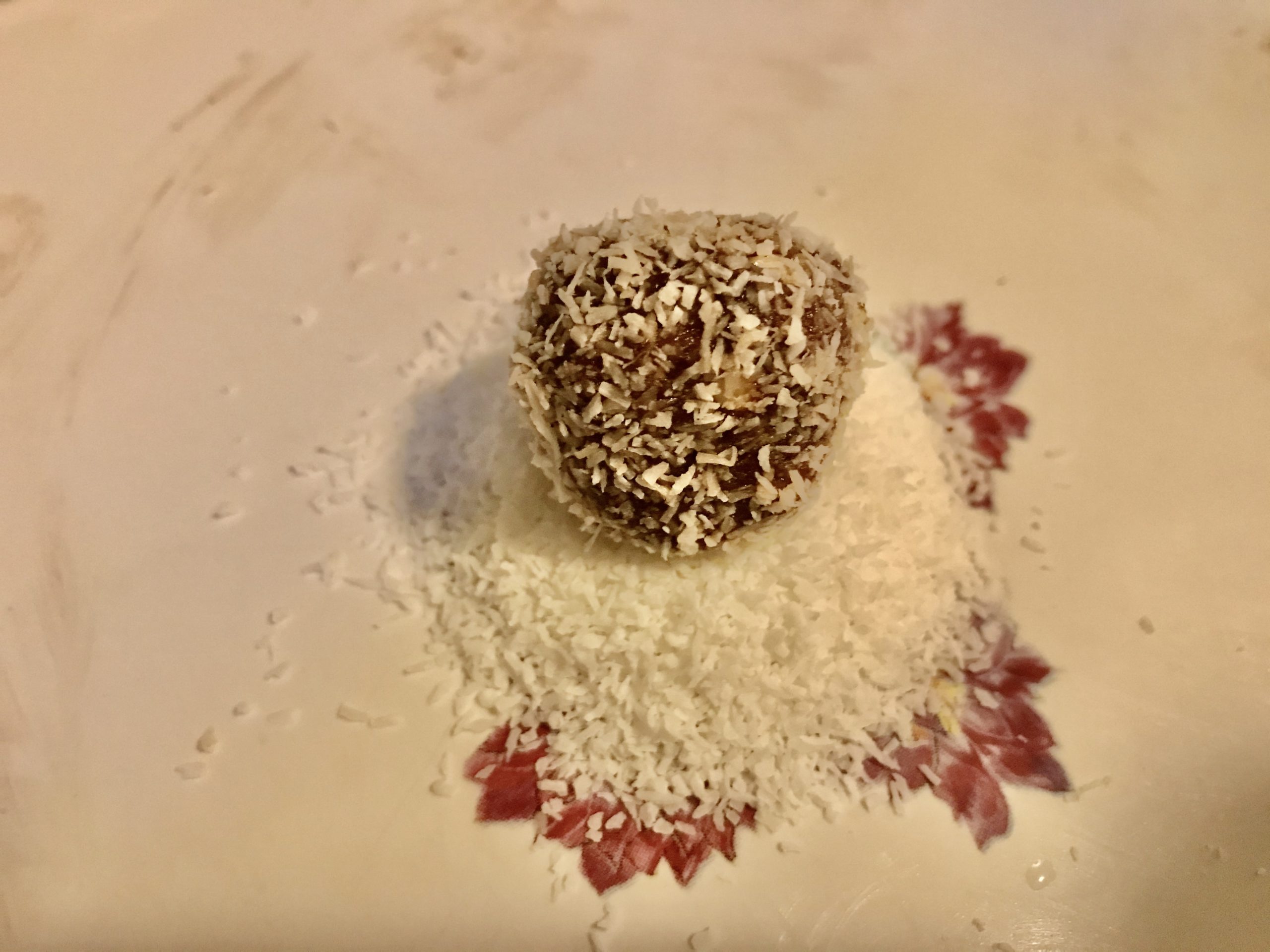 Op een bordje gooi ik ongeveer 20 gram kokosrasp. Het mengsel is kneedbaar, dus ik pak elke keer een beetje wat ik tot een bolletje kneed, en daarna door de kokos rol.
