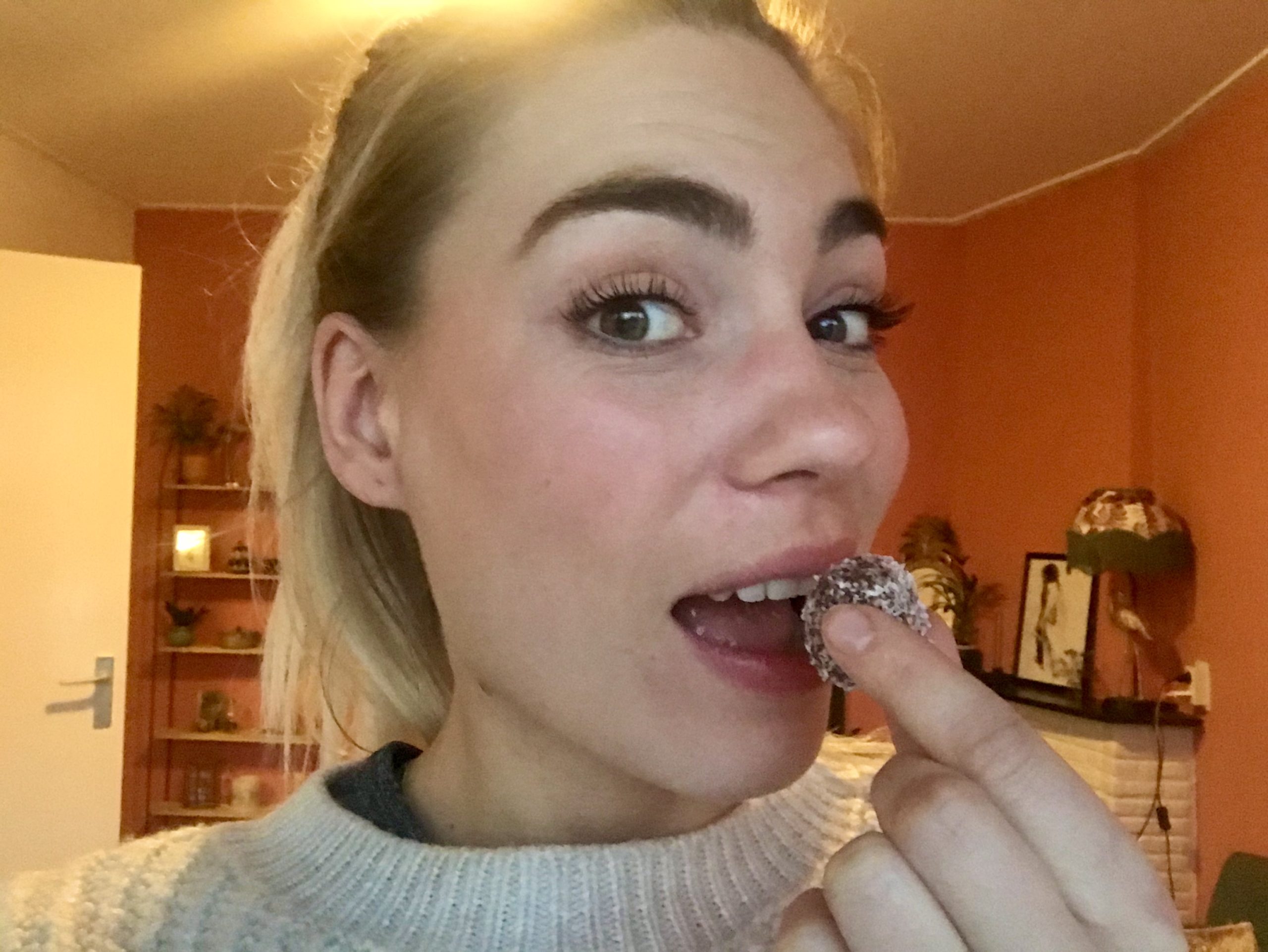 Ik vind dit ZO lekker! Ik ben sowieso gek op de smaak van dadel, maar de structuur hiervan vind ik ook echt heel erg prettig. Het is een fijne kleine bite voor bij de thee, waardoor mijn zoetbehoefte ook goed wordt gestild. Ik heb even een belachelijke foto toegevoegd zodat je de grootte een beetje kunt zien 🙂