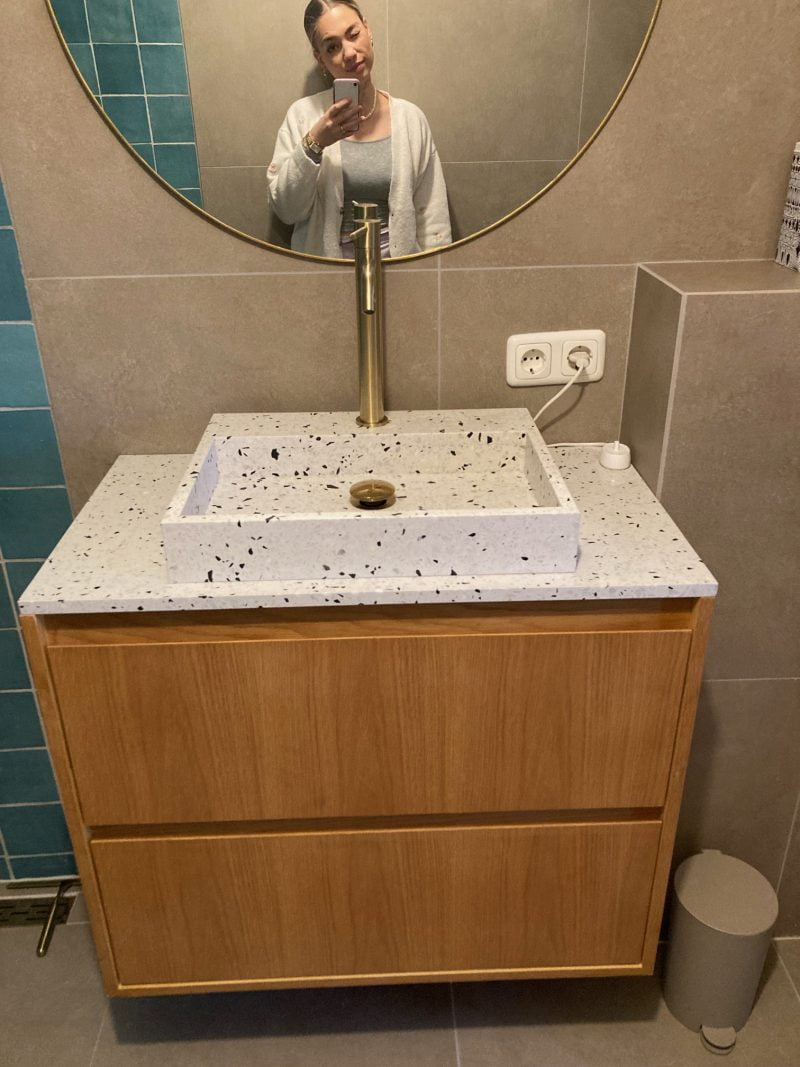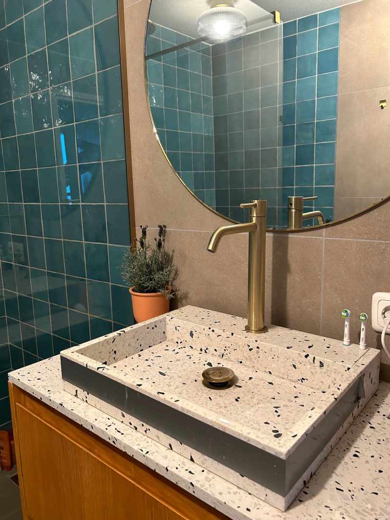 Punt 3 in de badkamer: het luxe badmeubel. Ik noem maar geen merken want dit is echt een pain in my ass. We dachten een luxe uitstapje te maken en te gaan voor een toffe eyecatcher. Een houten meubel met daarop een terrazzo blad met een lage rechthoekige waskom en goudkleurige kranen (net als de douche). Binnen een half jaar lag die hele waskom los en moesten we het uit nood met ducttape (zie foto 3) aan elkaar plakken. Het bedrijf zelf heeft ons extreem lang van het kastje naar de muur gestuurd, maar uiteindelijk hebben we -na een half jaar- een nieuw blad met waskom gekregen. De service was ruk, de communicatie nog meer.