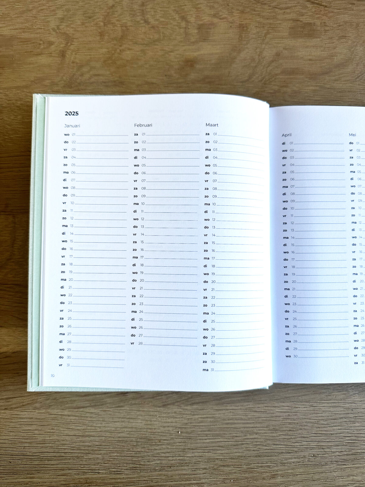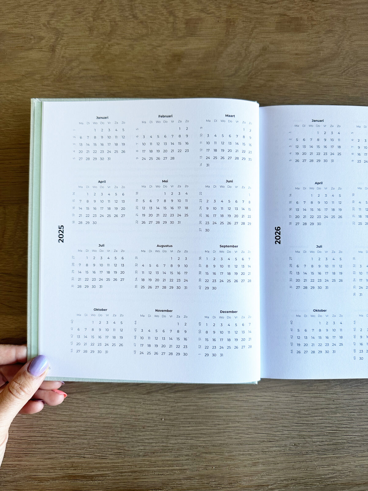 De planner loopt van 30 december 2024 tot en met 4 januari 2026. Je vindt in de planner jaaroverzichten, maandoverzichten, weekoverzichten, notitiepagina’s en een envelop achterin met een klein notitieboekje. Ook zitten er twee leeslintjes in.