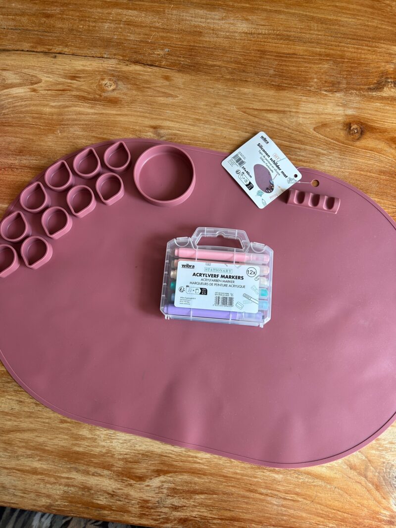 Ik was eerst een beetje aan het hannesen met folie op de tafel, maar inmiddels heb ik ook een knutselmat gekocht, die van mij is van Wibra maar een alternatief vind je hier. Dit is makkelijk schoon te vegen!