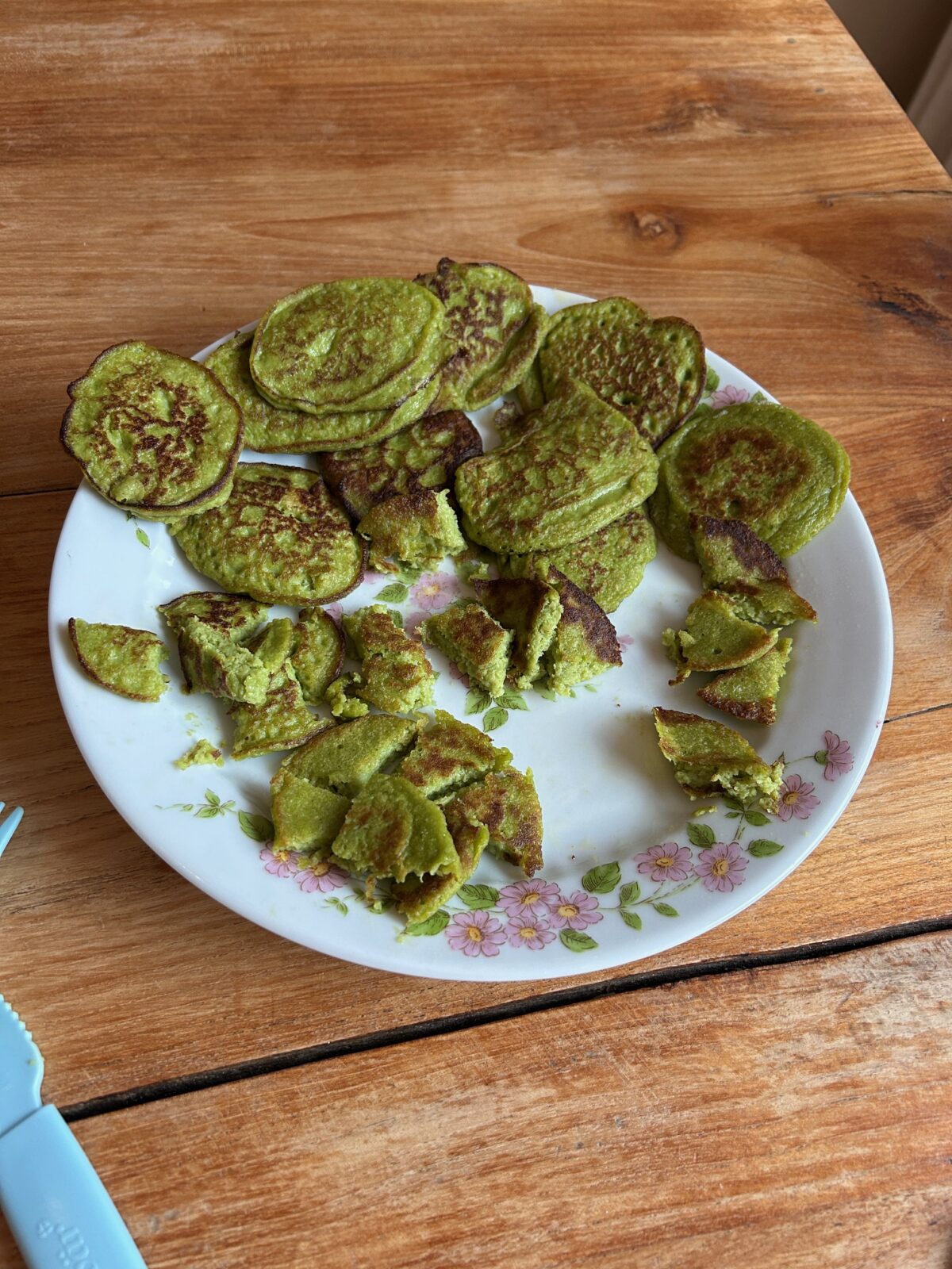 Ik geef haar dan de keuze in kleur; ‘Wil je roze, groene of oranje pannenkoeken?’. Roze is bijvoorbeeld rode kool, groen is spinazie of boontjes, oranje is wortel of zoete aardappel. Maar, ik heb ook wel eens ‘gele’ gemaakt met pastinaak of witte bonen. Die zijn dan helemaal niet echt fel geel maar daar gaat ze dan wel in mee haha. Lekker manipulatief van mij.