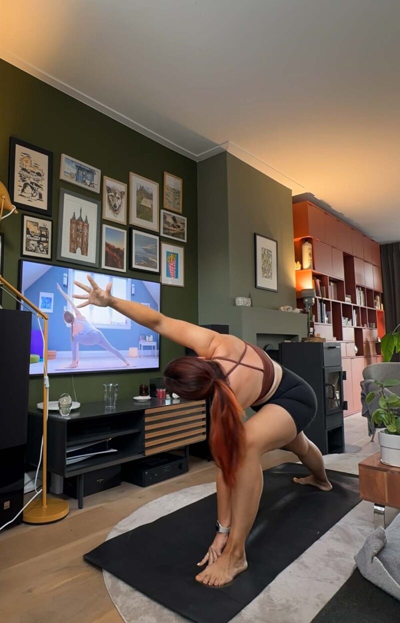 Gemiddeld doe ik zo’n twee tot drie keer per week yoga, al zijn er weken dat het vaker is en soms ook minder. Dat laat ik een beetje los, het hoeft niet perfect. Liever een paar keer per week op een fijne manier dan er weer een soort keurslijf van maken waar ik stress van krijg. Dat gaat nogal tegen het hele idee van yoga in voor mij, haha. Dus ik zie wel per week wat lukt en wat goed voelt, maar meestal is het wel meerdere keren per week.