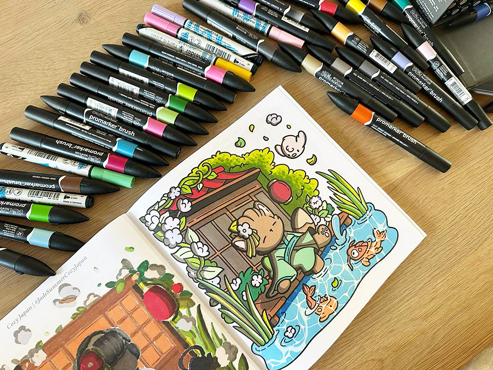 Deze kleurboeken kan je natuurlijk ook inkleuren met potloden, of andere stiften. Maar de combi met de alcoholmarkers is een héle fijne.