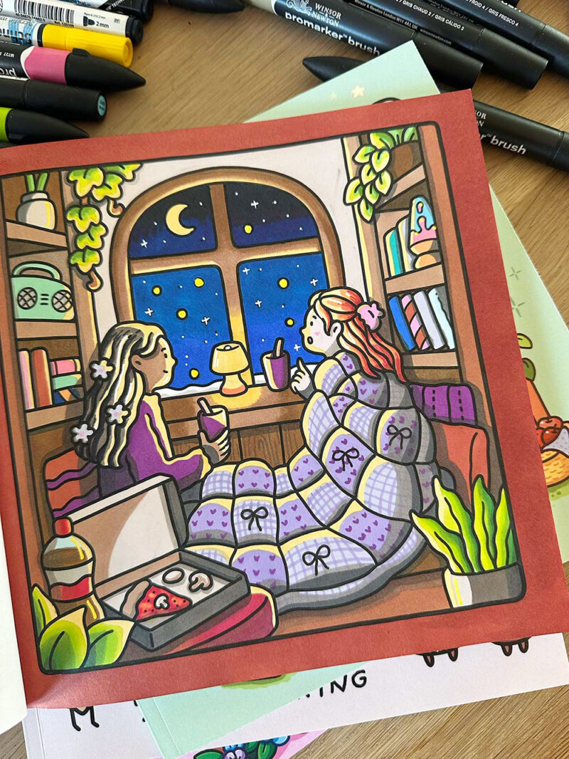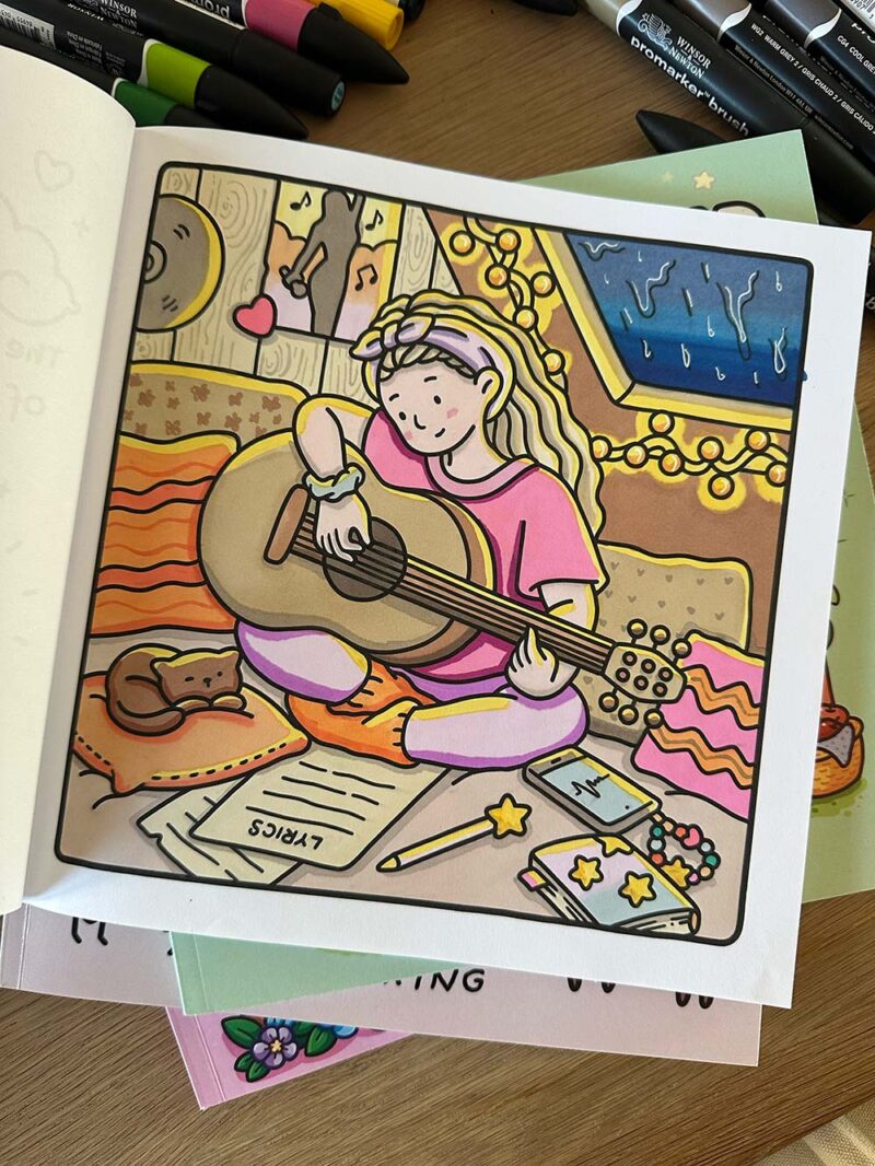 •Je hoeft nergens over na te denken – Je slaat een pagina open en begint gewoon. Geen keuzestress, geen ‘wat als het mislukt’. Alleen maar kleuren.