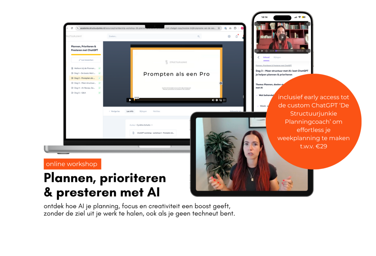 - 5 praktische workshops (ruim 5 uur): opnames van de Structuurjunkie Membership Plannen, Prioriteren en Presteren met ChatGPT Liveweek, boordevol voorbeelden, hacks, tips en tricks voor werk én privé.
