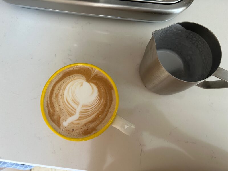 Mijn latte art was even niet zo geweldig maar ik ben dan ook al een tijdje achter de machines weg haha. Ik noem het een tulp. Andere momenten krijg ik inmiddels gelukkig weer mooie hartjes en rosetta’s. Hoewel deze machine echt heel veel uit handen neemt en je bijna gegarandeerd bent van een perfecte koffie, zijn er een aantal dingen die ook bepalend zijn voor je uiteindelijke koffie. De melk die je gebruikt, de grootte van het kopje, of je het kopje hebt voorverwarmd en natuurlijk de soort bonen die je in de machine gooit. Dit is allemaal afhankelijk van je persoonlijke voorkeur, en daar moet je een beetje mee spelen in het begin.