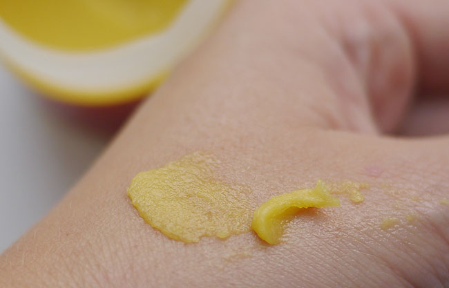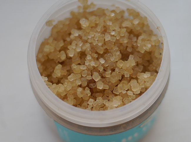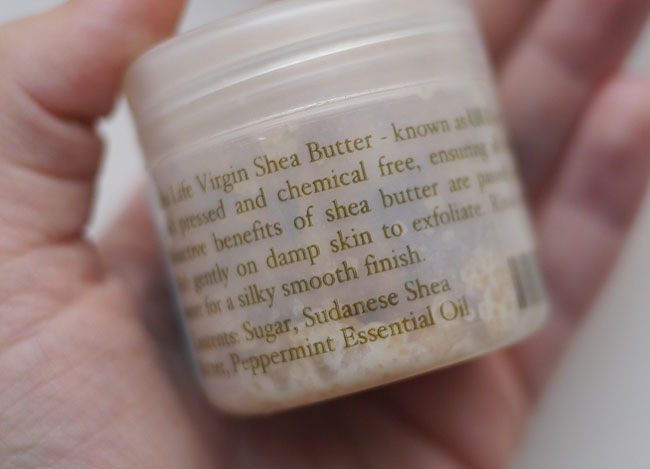 Dit is de shea boter scrub, gemaakt van suiker, shea boter en essentiële olie. Dit breng je aan op je natgemaakte huid, en met ronddraaiende bewegingen verwijder je dode huidcellen. Het voelt lekker aan, scrubt stevig en ruikt ook erg lekker. Het is honderd procent natuurlijk en handgemaakt door de vrouwen in Zuid-Soedan. Een pot van 260ml kost €10,95, het potje op de foto is kleiner en is een probeerverpakking. €10,95 voor 260ml scrub is niet duur!