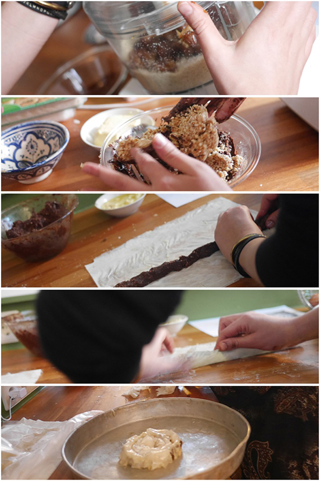 Het dessert! Hiervoor worden amandelen fijngemalen met dadels en daarna gekneed met gesmolten pure chocola. Daarna worden ze in filodeeg ingesmeerd met roomboter gerold.
