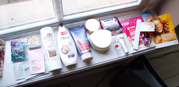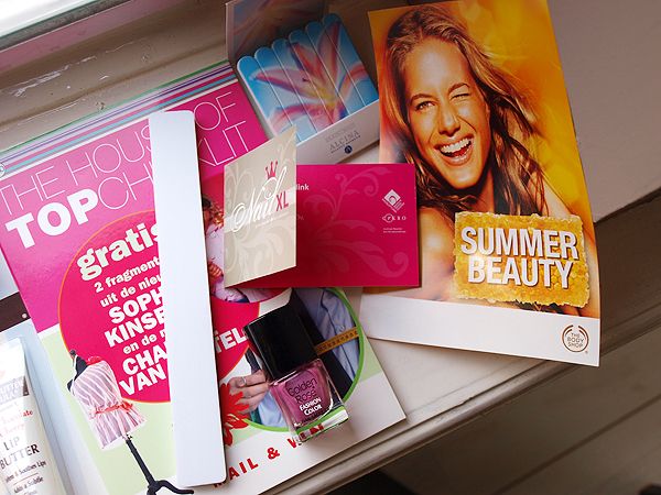 Een boekje met fragmenten uit chicklit van The House of Books, een vijl en nagellak van Nail XL, een setje minivijltjes van Alcina (Salon Mengerink) en rechts een kortingsbon van The Body Shop