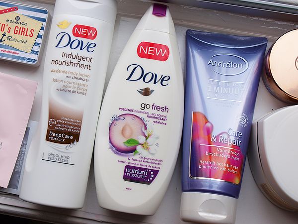Dove Indulgent Nourishment Voedende Bodylotion, Dove Go Fresh Voedende Douchegel en Andrélon Iedere Dag 1 Minuut Masker