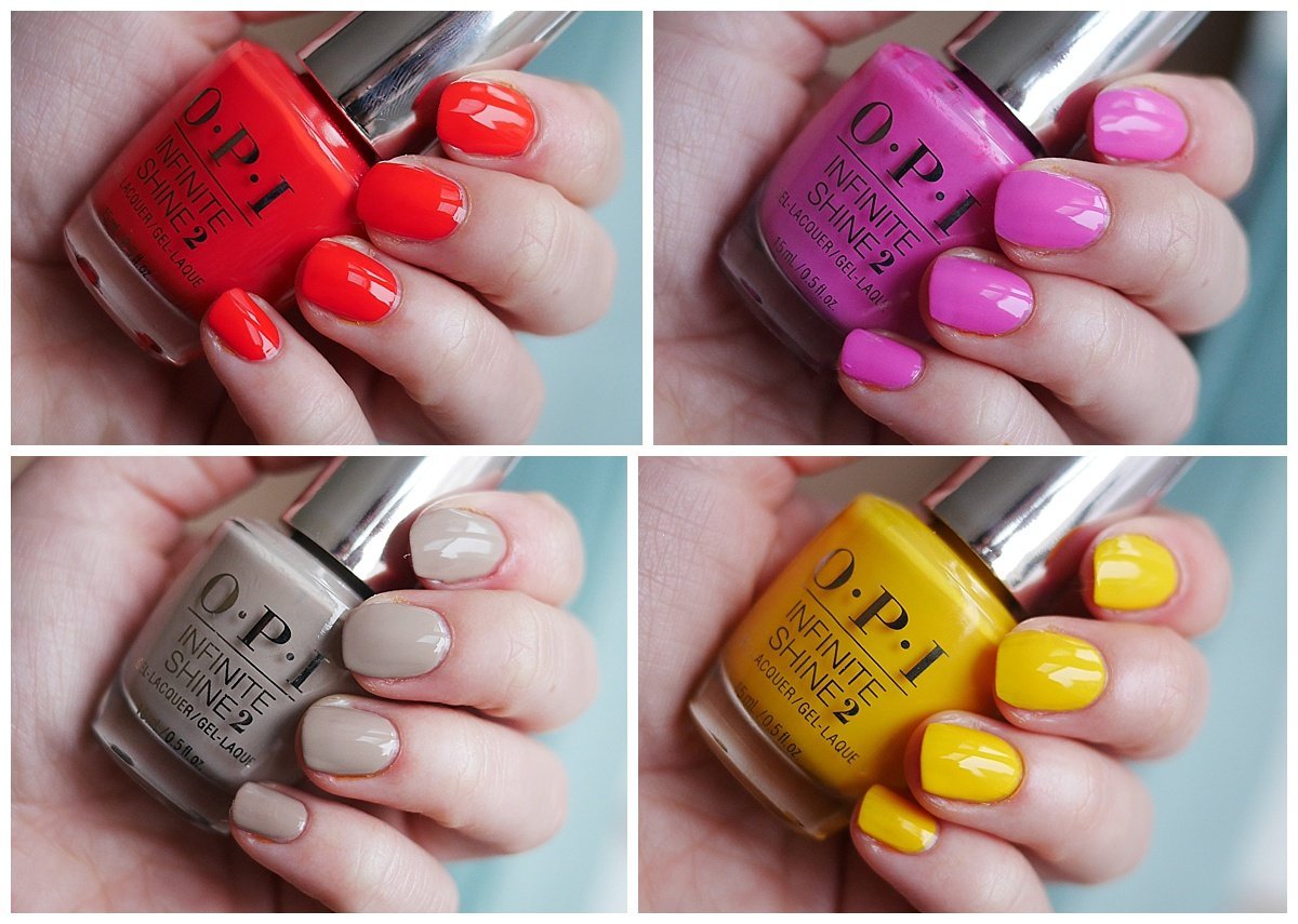 Al deze kleuren hebben drie laagjes nodig. Ik gebruik op deze foto’s OPI Infinite Shine nagellak, maar ze zijn ook verkrijgbaar in ‘gewone’ OPI nagellak en in OPI gelcolor. Van deze vier vind ik No Tan Lines fantastisch, wat een mega zomerse kleur!