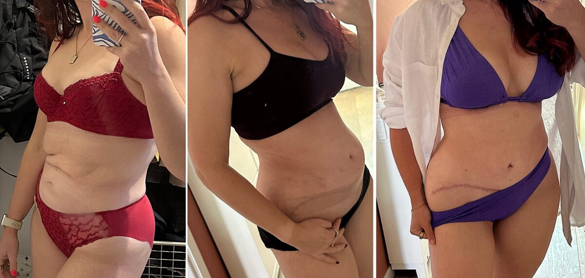 Hieronder wat foto’s van hoe mijn buik er nu uitziet. Links is voor, midden na 9 weken, rechts nu.