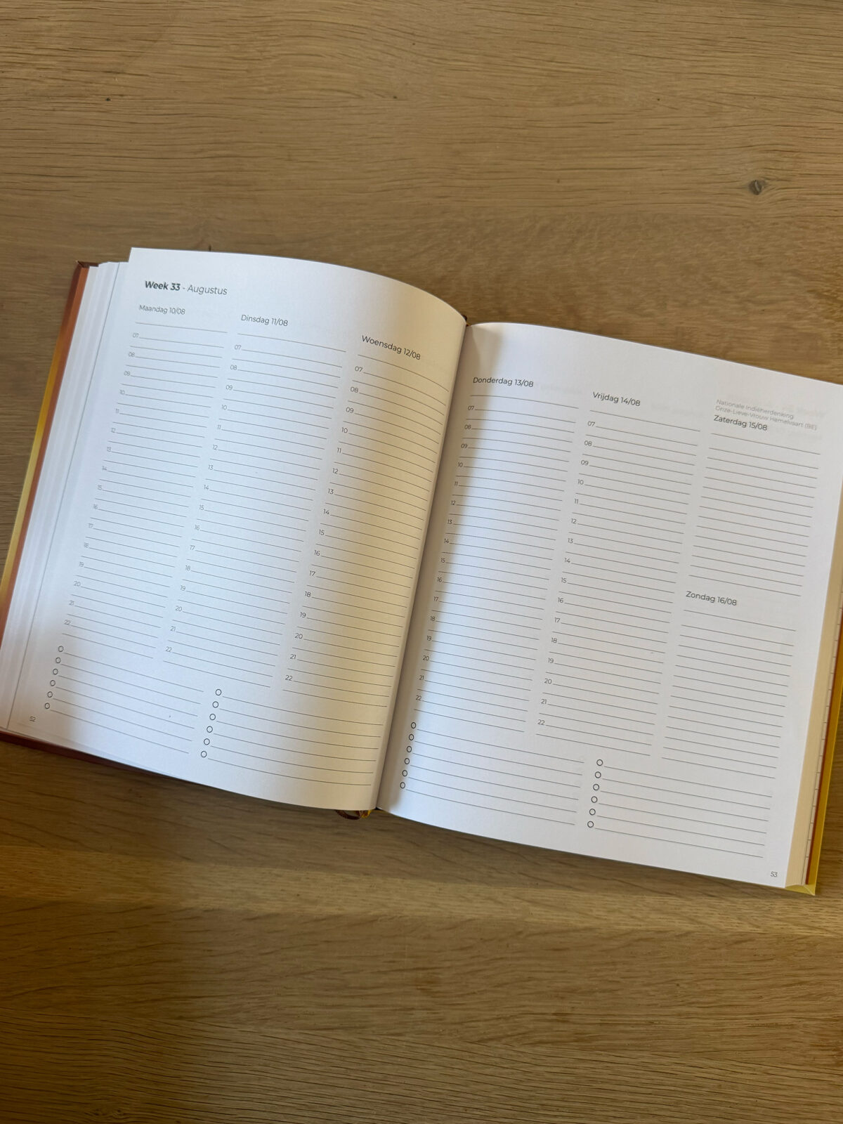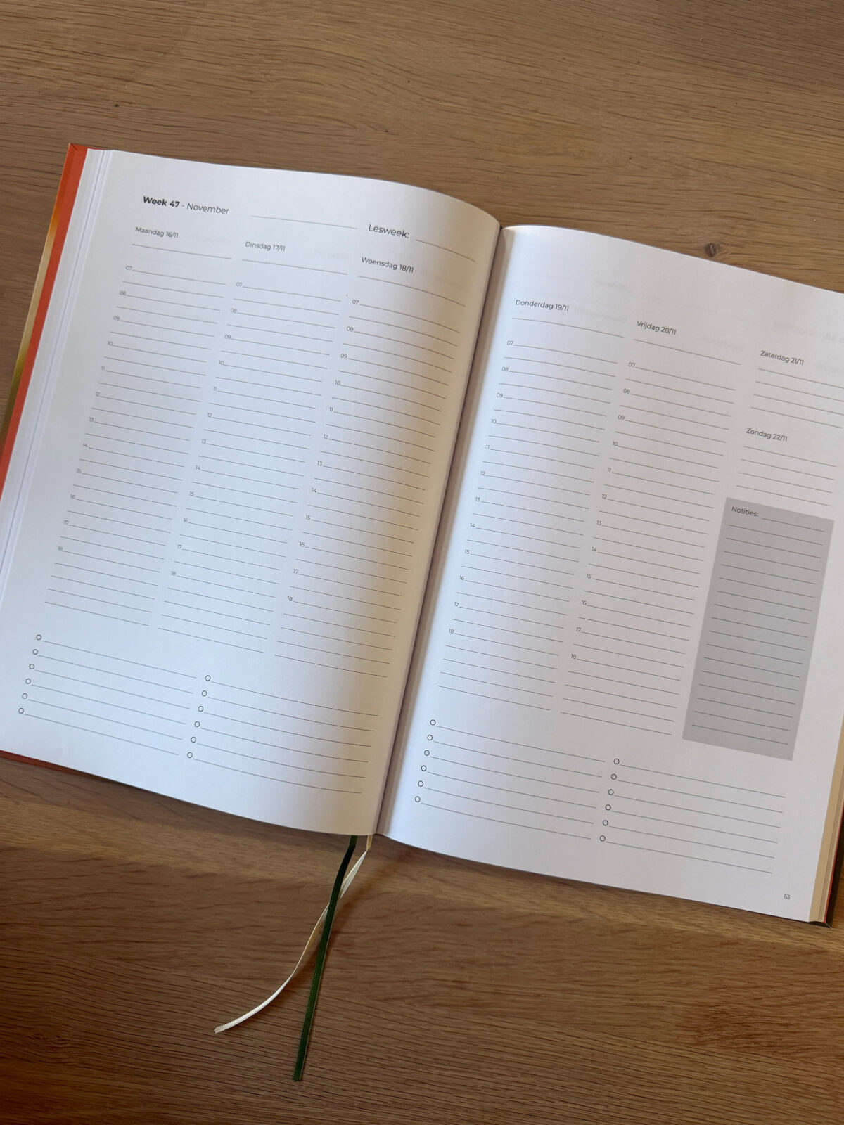- Voor elke week een duidelijk weekoverzicht met dagen van 7 tot 18u met extra notitieruimte voor de avond