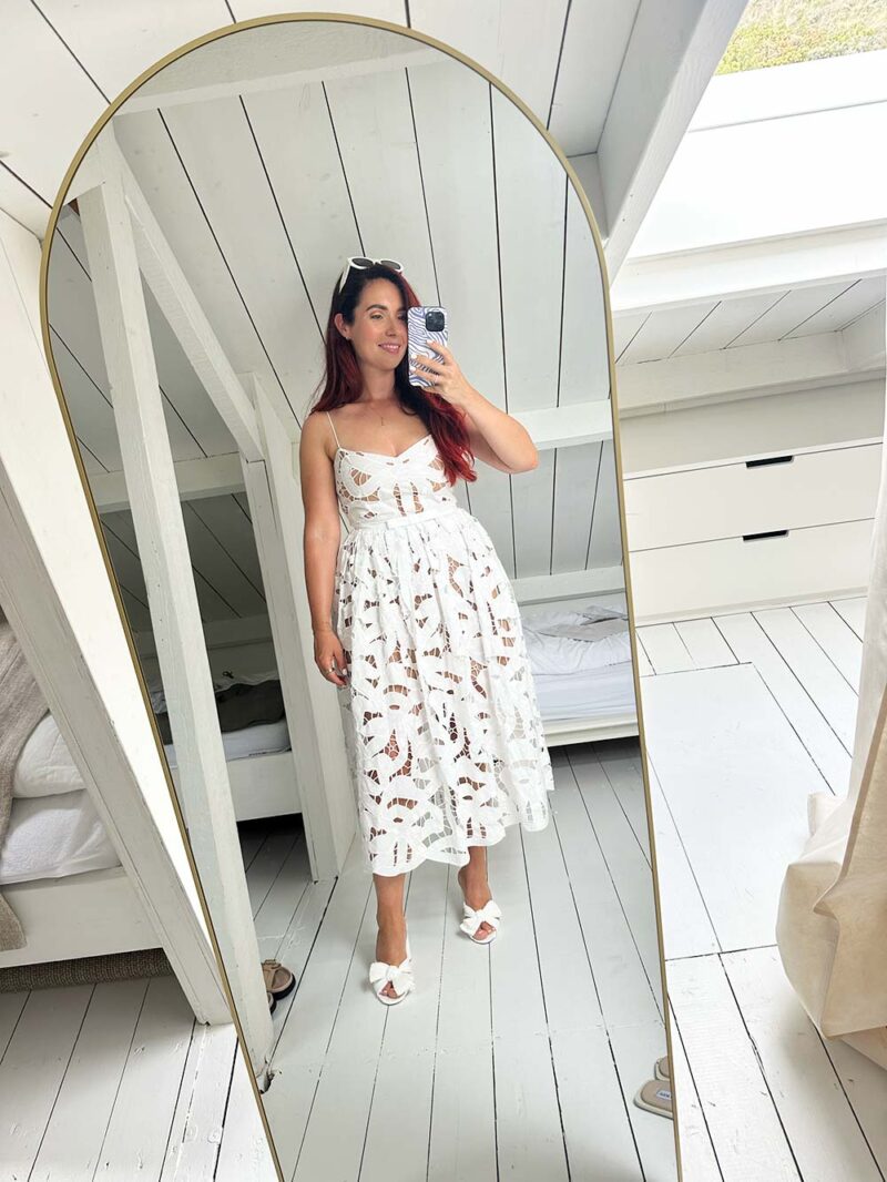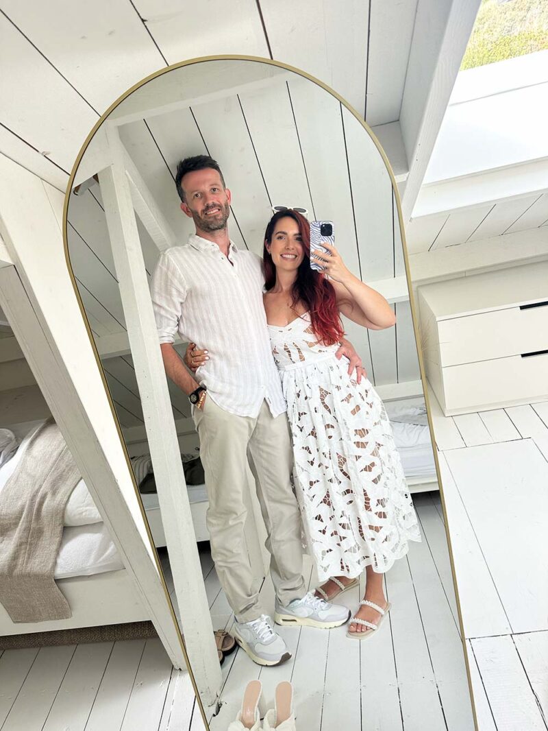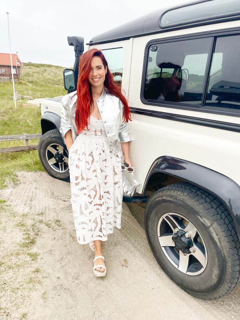 Willem en ik hadden voor deze dag niet per se een ‘bruiloft outfit’ gepland, maar mijn jurkje was dat toch uiteindelijk wel, haha. Ik koos voor een jurk van Self Portrait, waar ik meteen helemaal blij mee was toen ik hem paste. Ik had ook mooie hakken, maar dat was nogal zinloos in het mulle zand, dus die heb ik helemaal niet aan gehad. De platte sandalen zijn van Steve Madden, maar heb ik helemaal niet aan gehad, was steeds op blote voeten. Het zilveren jasje had ik al en is van Sofie Schnoor, en het was fijn dat ik die had want het was best een beetje fris. Mijn zonnebril is van Penn & Ink. Willem zijn broek is van SuitSupply, de blouse kocht hij bij Fraai op het eiland en zonnebril is van Ray-Ban.
