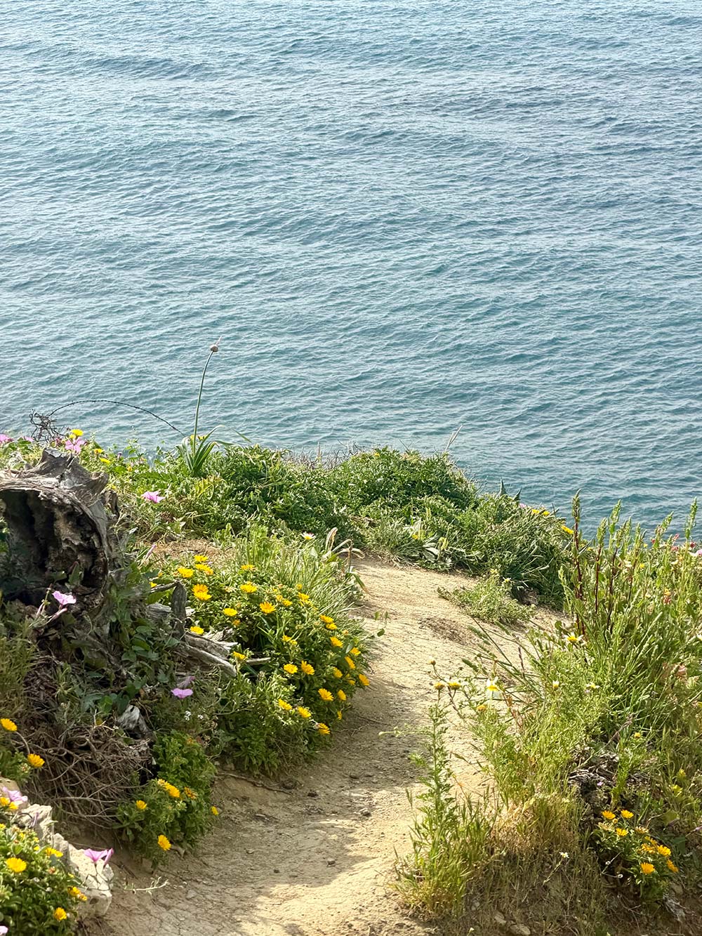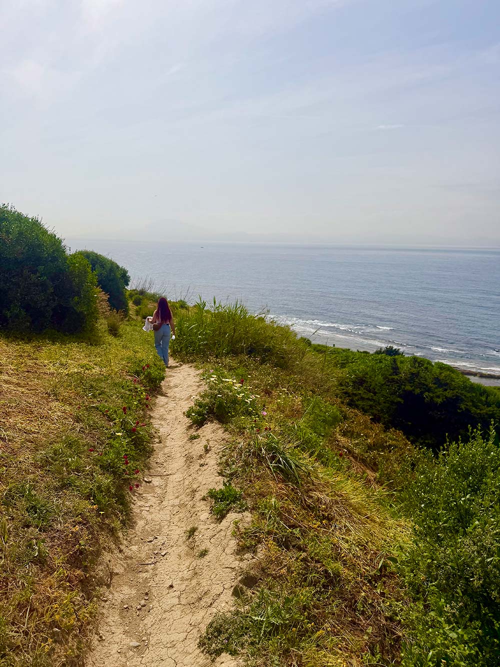 Als we aankomen in Tarifa gaan we eerst een wandeling maken langs de kust. En die is zó mooi! Overal prachtig uitzicht, de combinatie van bergen en zee, en zó groen en overal bloemen!