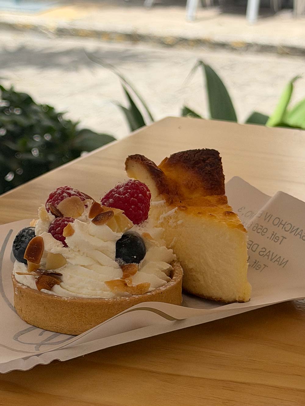 Bij Pastéleria Bernal haalden we deze taartjes en koffie. En dat was méga lekker. De tartelette had wel alleen slagroom, ik hoopte nog op een andere vulling, maar het smaakte wel erg goed.
