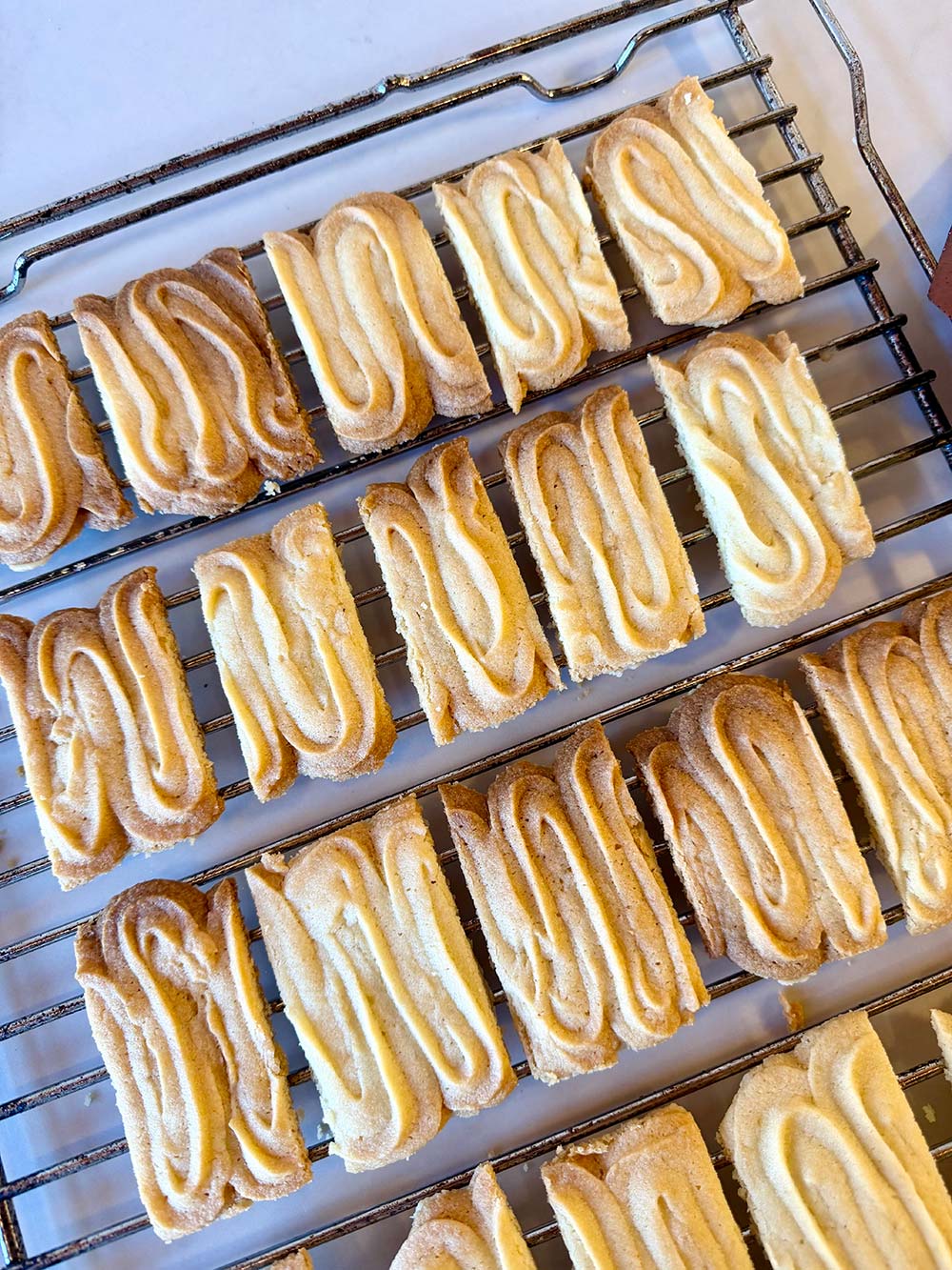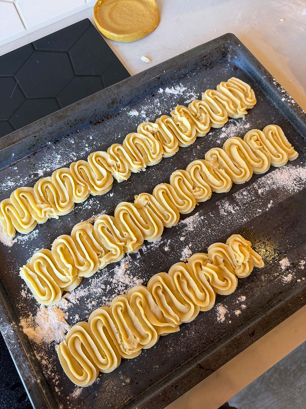 Ik maak voor het eerst spritsen! Nou, dat was nog wel wat lastiger dan ik dacht, vooral het opspuiten. Het deeg is vrij stevig, maar moet wel door zo’n zak en spuitmond heen. Maar! Het lukte. Niet megastrak, maar hey, het is de eerste keer.