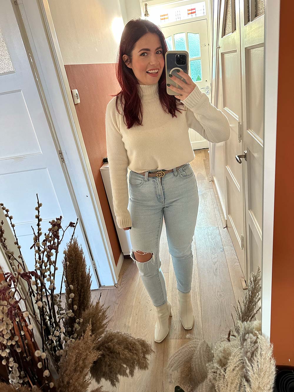 Outfit. De jeans is van Levi’s (de Taper Fit Mom Jeans in de kleur No Joke), de trui is van Bellamy en de laarsjes van Josh V.
