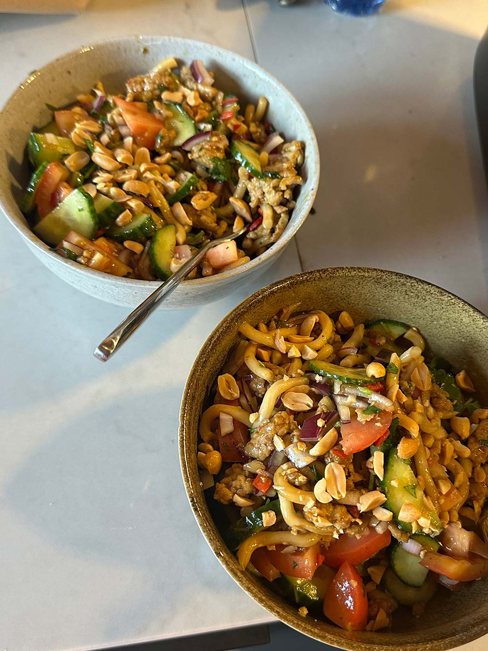Dit is een van mijn favoriete HelloFresh maaltjes: udon noodles met kipgehakt (hij is er ook regelmatig vegetarisch), zoetpittige saus, groente en pinda’s.