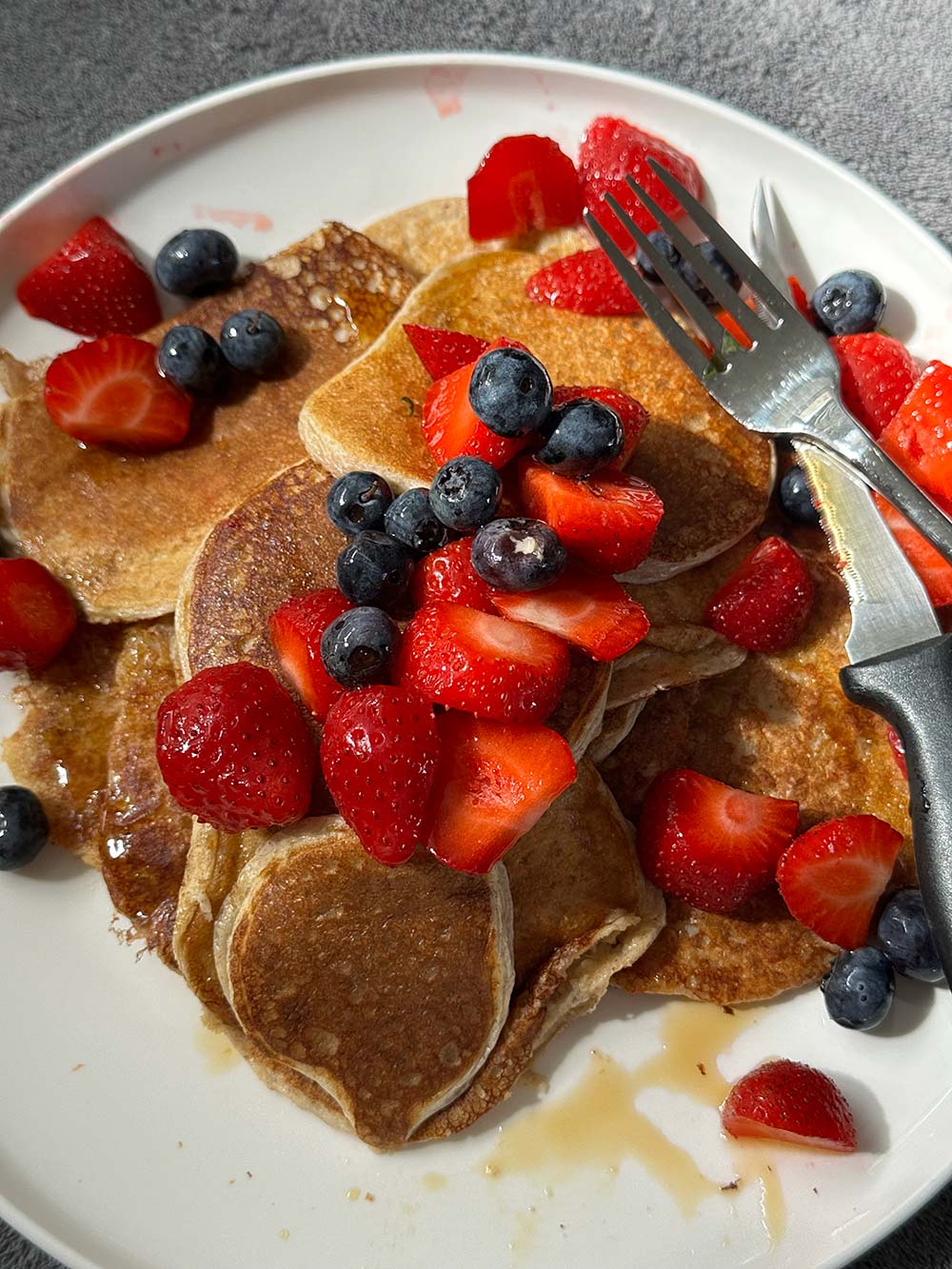 Pancakes voor lunch. Deze maakte ik met havermout, eiwitpoeder en ei.